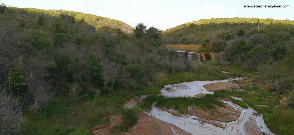Pictured above, the resistant, cliff-forming formation in the distance is of westward-dipping “Black Reef” quartzite. This thin, hard quartzite formation blankets the landscape of the “Great Eastern Escarpment”. It was deposited on the floor of the inland Transvaal Sea as a clean, pebbly sandstone less than 2.65 billion years ago. It formed a covering that long resisted the underlying softer Basement granite-gneiss. The “Black Reef” formation underlies the thick “Malmani” dolomite sequence in the valley, in which the many caves have formed; [Note: A normal fault separates the two formations at the valley bottom where the fault formed the creek bottom through erosion].