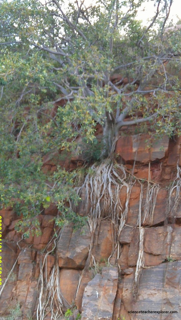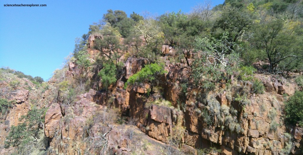 Pictured above, the tenacious roots of the rock fig have established a good hold on exposed Waterberg sandstone along the roadside. The rocks below contain abundant iron oxide in the form of hematite that occurs as coatings around sand grains or as thin layers along bedding planes or cross-beds, and this feature is an important geological marker in Earth’s evolution.