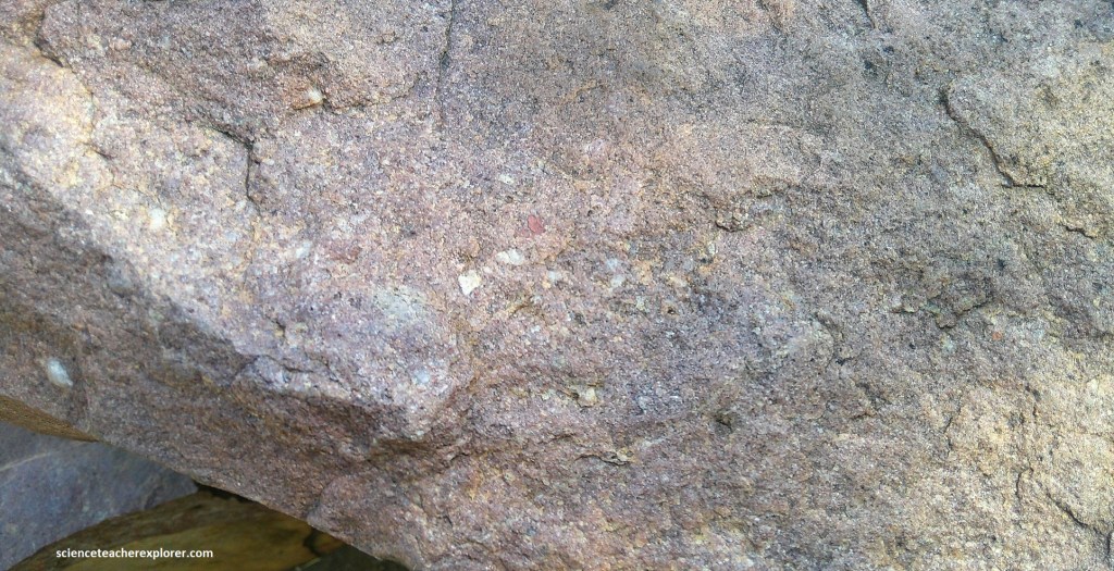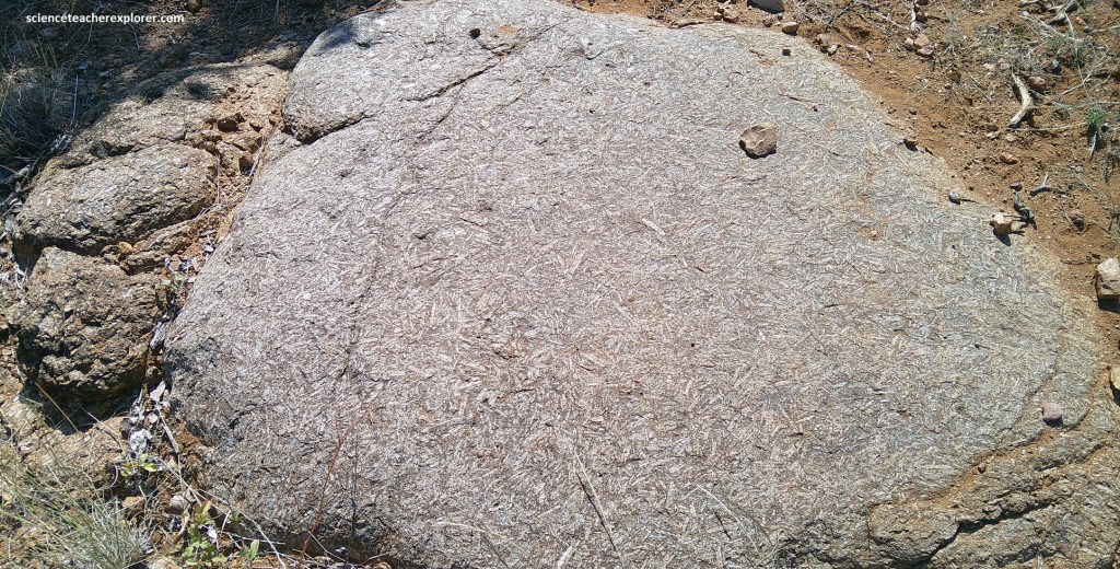 Additionally, molten rock from the mantle has been pushed up through the crust, creating intrusions that influence the region’s topography. Much of it are now now isolated remnants of the dark, fine-grained basalt that caps some the the hilltops. Pictured below is an unusual porphyritic and coarse-grained texture of a dolerite dyke that cuts through sandstone near the Interpretation Center. This is one of a swarm of east-west-trending Karoo dolerite dikes in the region.