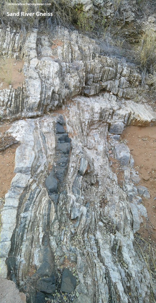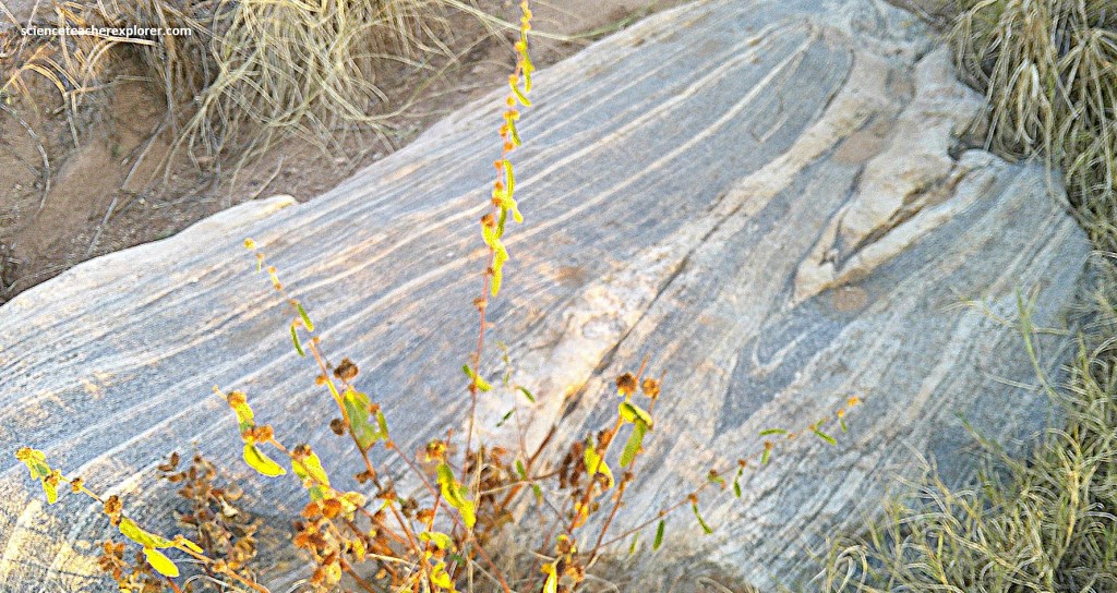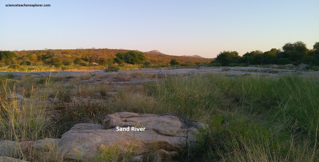 From Wyllie’s Poort, the N1 highway; north to Musina crosses an unspectacular plain before dropping down into the dissected terrain of the Limpopo River Valley. The dry sandy landscape of baobabs & mopane trees, hides the extremely complex “Central Zone of the Limpopo Orogeny Belt”. This is a broad zone of gneisses and metasedimentary rocks characterized by intense structural deformation, strong metamorphism and melting of the original rocks during several major tectonic episodes 3.4-3.2 billion years ago. This “Central Zone” is represented at the Sand River, 4km southeast of Musina, (pictured below). We accessed this site via the Musina Nature Reserve off of N1.