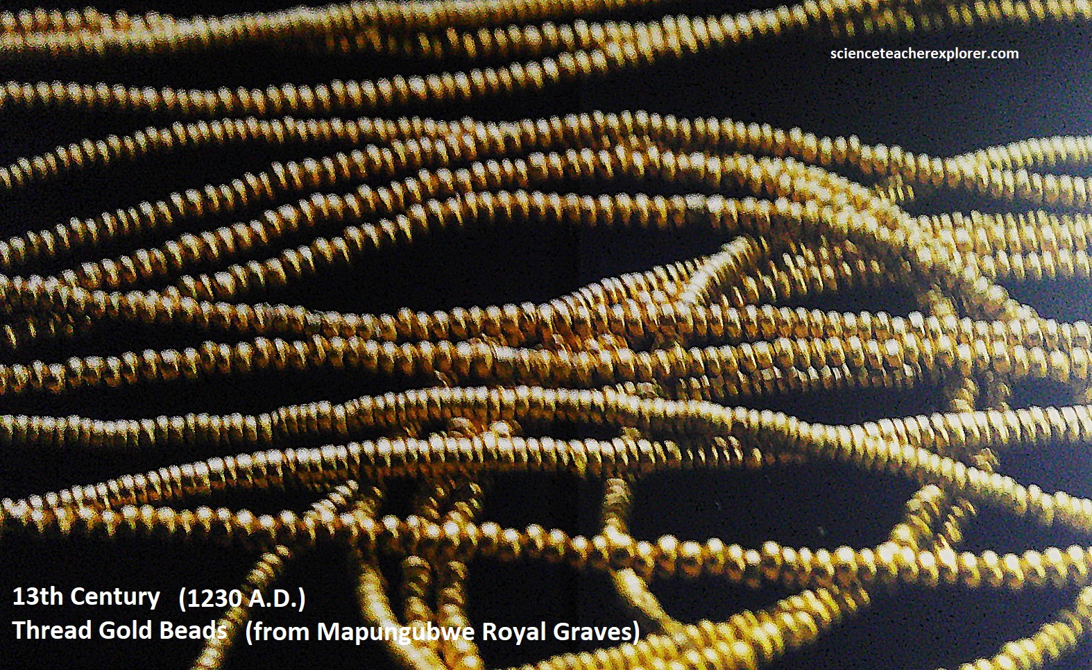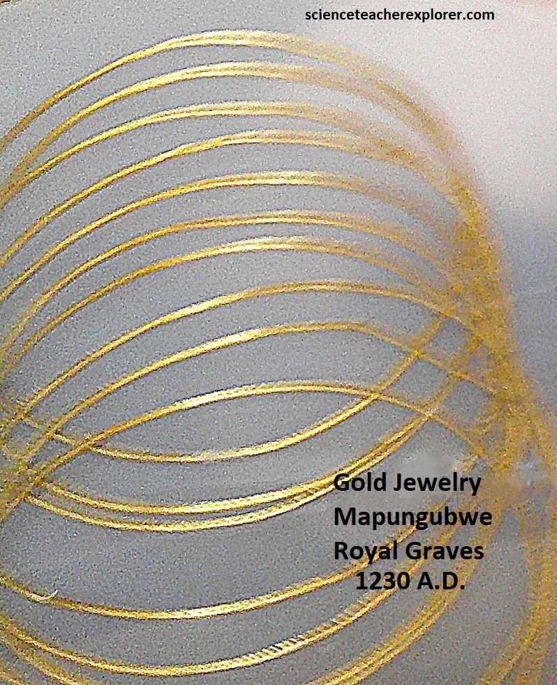 The Peak of the Mapungubwe Civilization–1150-1320 A.D.: From 1150 A.D., as the ruling elite became more powerful and wealthy, they moved out of the valley at K2 to a new settlement on top of the Mapungubwe Hill. With an estimated population of 9,000 people, the king and his entourage lived at the hilltop, while the royal wives and families lived on the slopes. Commoners continued living in outlying villages along the river valleys. By the late 1200s A.D. Mapungubwe had a sophisticated economy based on iron, copper, gold-mining and trade. The bulk of the economy included sectors such as agro food production, ceramic, textile and jewelry manufacturing as well as long-distance trade. {Pictured below are items excavated from the area and displayed on-site that are of the 1200-1350 A.D. age}.