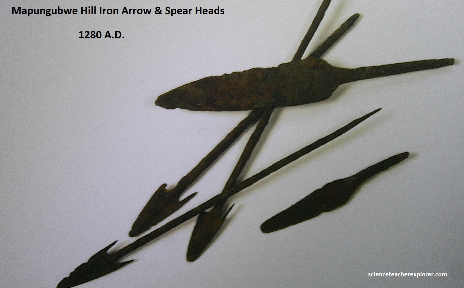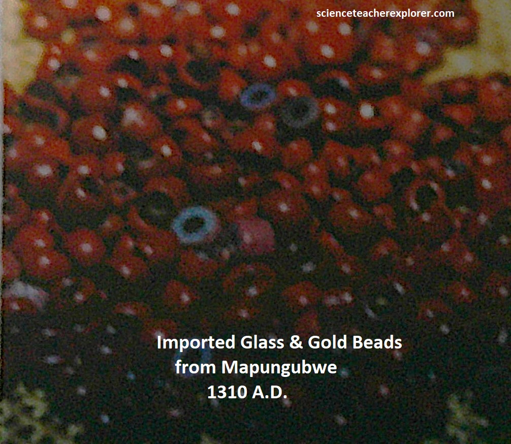 The origins of the southern African civilization from 900-1000 A.D.: For millennia, the vast savannas of the Shashe-Limpopo River Basin, stretching to the Blouberg escarpment, ancestors of the San hunter-gatherers prospered in this region. Attracted by the thriving herds of elephants, Iron-Age African farmers migrated into the Confluence Basin around 900 A.D.. They built their settlements in arable areas along the valleys of Limpopo and other rivers. Over a century, they built the region’s first large human settlement on the slopes of the Schroda Hill high above the Limpopo River valley, with about 500 people living on the plateau. They had specialized iron-workers and entrepreneurs who exported exotic animal skins and ivory through the East African Indian Ocean Coast and imported sild and glass beads, among other luxury products. {Pictured below are items excavated from the area and displayed on-site that are of the 900-1000 A.D. age}.