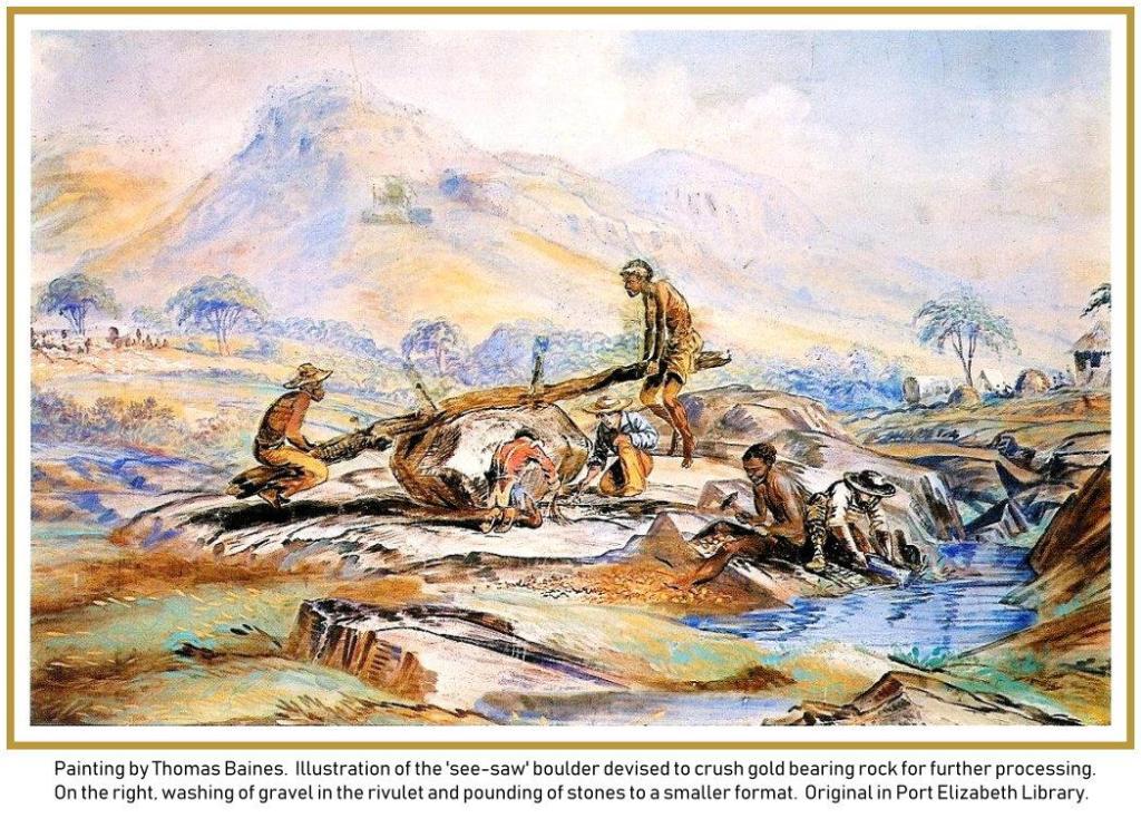 After purchasing the farm, Button soon found rich alluvial gold coming from a deeply weather reef. It was initially recovered by sluicing, but soon the gold was being won by crushing the weathered quartz reef with a primitive see-saw fashion under a large round boulder, devised by William Pigg, one of Button’s mining partners, (imaged below).