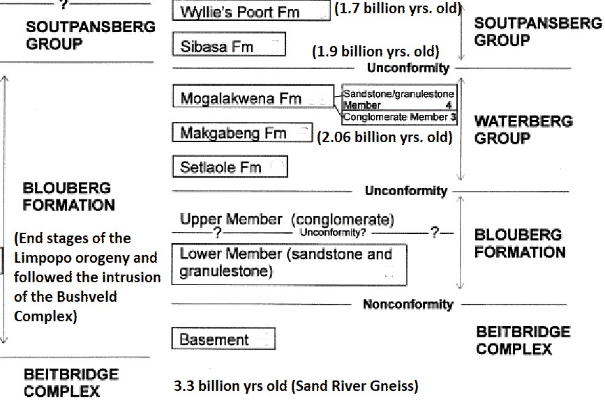 Pictured above, this exposure shows typical shallow-water, channel-like cross-bedding and scattered quartz pebbles, indicating deposition on a braided, alluvial plain. This reveals that the Mogalakwena Formation consists entirely of maroon to grey-brown, coarse to medium grained, quartz-rich sandstone and occasional thin conglomerate layers and scattered pebbles. These rocks were deposited on extensive flood plains crossed by multiple braided river channels that rapidly transported an abundant supply of sandy sediment from the highlands located to the northeast to a shallow sea in the southwest.
