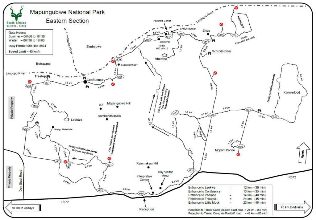 The Mapungubwe N.P. forms part of the outlying Tuli Basin, a narrow east-west sedimentary basin of Karoo age, (320-180 million years old), that comprises a restricted sequence of the Karoo Supergroup. Here, only the eolian Clarens Formation is exposed, consisting of upper Tshipise Member sandstone overlying Red Rocks Member siltstone. Erosion of the sandstone has formed a landscape of numerous small, steep-sided mesas and isolated buttes, (like the Mapungubwe Hill pictured below), separated by wide sandy valleys, eroding towards the Limpopo River.