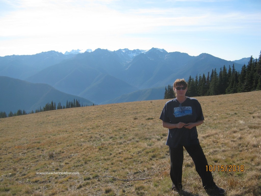 the most beautiful views of the Olympic Mountains are found from the vantage point of Hurricane Ridge, (pictured below with Becky). The line of mountains running in a north south direction and visible from Hurricane Ridge is the Bailey Range. This range actually sits east of, and from the perspective of Hurricane Ridge, in front of, Mt. Olympus. The Bailey Range form the backbone of the Olympics. The Bailey Range resemble the teeth of a saw blade. The characteristic “folds” of the range, visible below, are formed by the erosive action of melting snow and dripping glaciers. The mountains of the Olympic ranges, specifically the Bailey Range, pull moisture from the air which flows in from the Pacific. This creates a rain-shadow which results in an extraordinarily wet-climate on the west side and a dry one on the east side. The climate west of the crest of these mountains is the driest on the northern Pacific Coast.