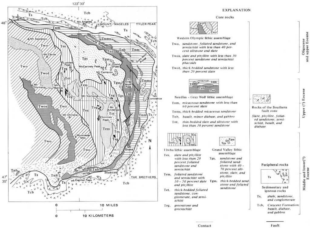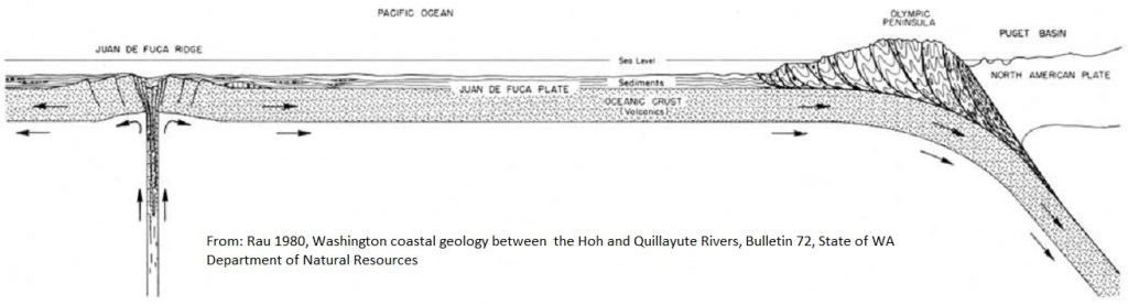 It seems evident from the above USGS map and the drive up the Hurricane Ridge road, that most of the sedimentary rocks of the Olympics were deposited on basaltic oceanic crest, although some were laid down on partly submerged continental rock that may have been on the leading edge of the North American plate.
