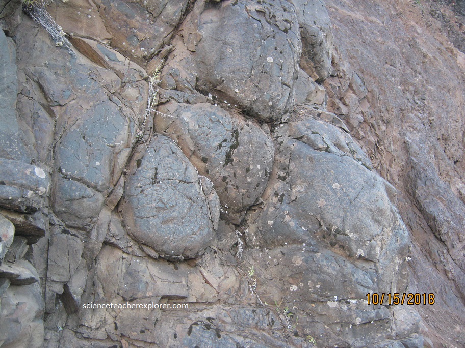 While the sediments were still accumulating on the ocean floor, great quantities of basaltic submarine lava began welling up and spreading over or interfingering with the sedimentary layers. In some places lava flows piled up so high that offshore islands may have been formed, geologically called microcontinents or terranes. Most of the flows cooled quickly under water as pillow lavas or brecciated rocks shown below on the road towards the Hurricane Ridge.