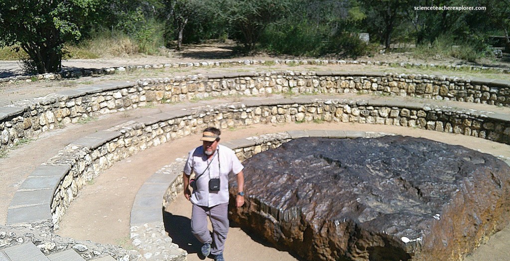 The Hoba meteorite in Namibia is the largest known meteorite on Earth; no other fragments of this body have been found in the surrounding area, suggesting it travelled through Earth’s atmosphere without ever fragmenting. Weighing about 60 tonnes, this iron meteorite was found hear-near Grootfontein and is thought to have landed some 80,000 years ago. It is composed mostly of iron (82.4%) and nickel (16.4%), with some cobalt and various trace elements such as carbon, sulfur, chromium, copper, zinc, gallium, germanium and iridium, (Pictured below with Tracy Davis standing next to it). Iron meteorites come from the disintegrating cores of asteroids, a belt of bodies in orbit between Mars and Jupiter.