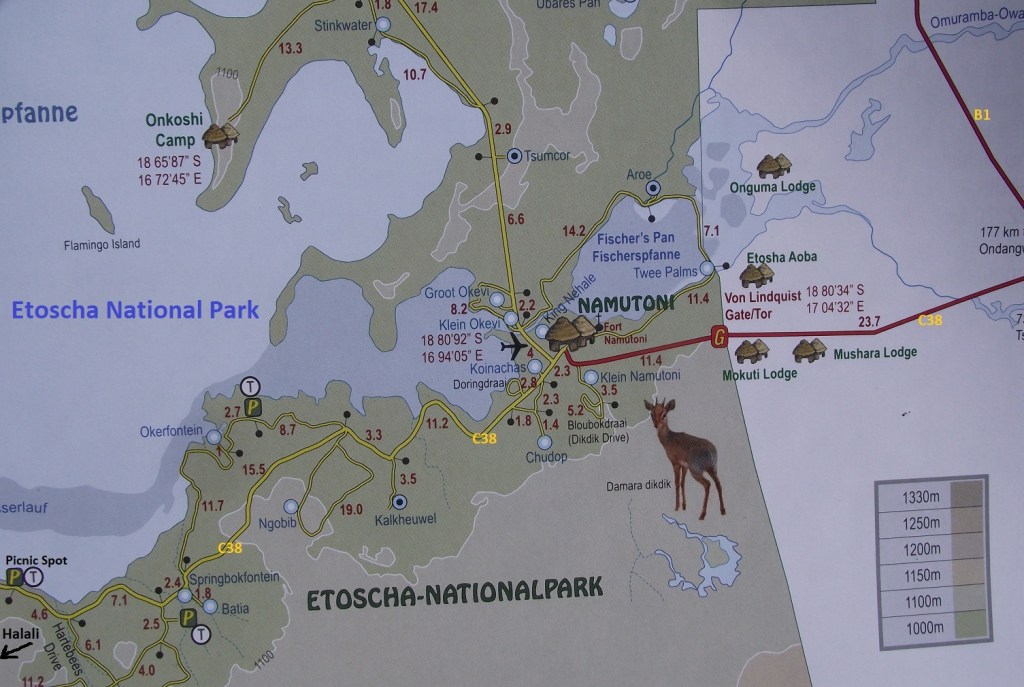 Later, Tracy and I drove north of Otjikoto Lake on highway B1 to road C38. There we turned left to enter and explore the Etoscha National Park. The pan, situated at 1,200m above sea level, constitutes the largest part of the Etoscha National Park and morphologically represents a part of the Ovambo Basin.