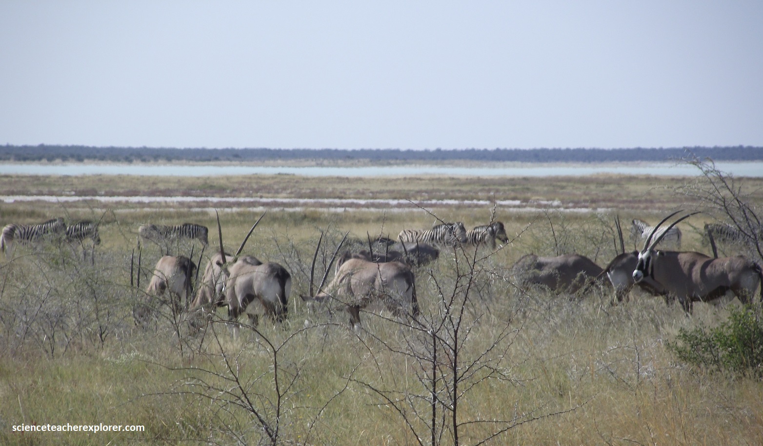 Pictured above, are a mix of Plains zebras (Steppenzebra) and Gembok (Oryx gazella). The Gembok is a large, powerful antelope with striking black and white markings and long, spear-like horns, known for its ability to thrive in the arid, desert-like conditions of Southern Africa, making Etoscha an ideal habitat for it.