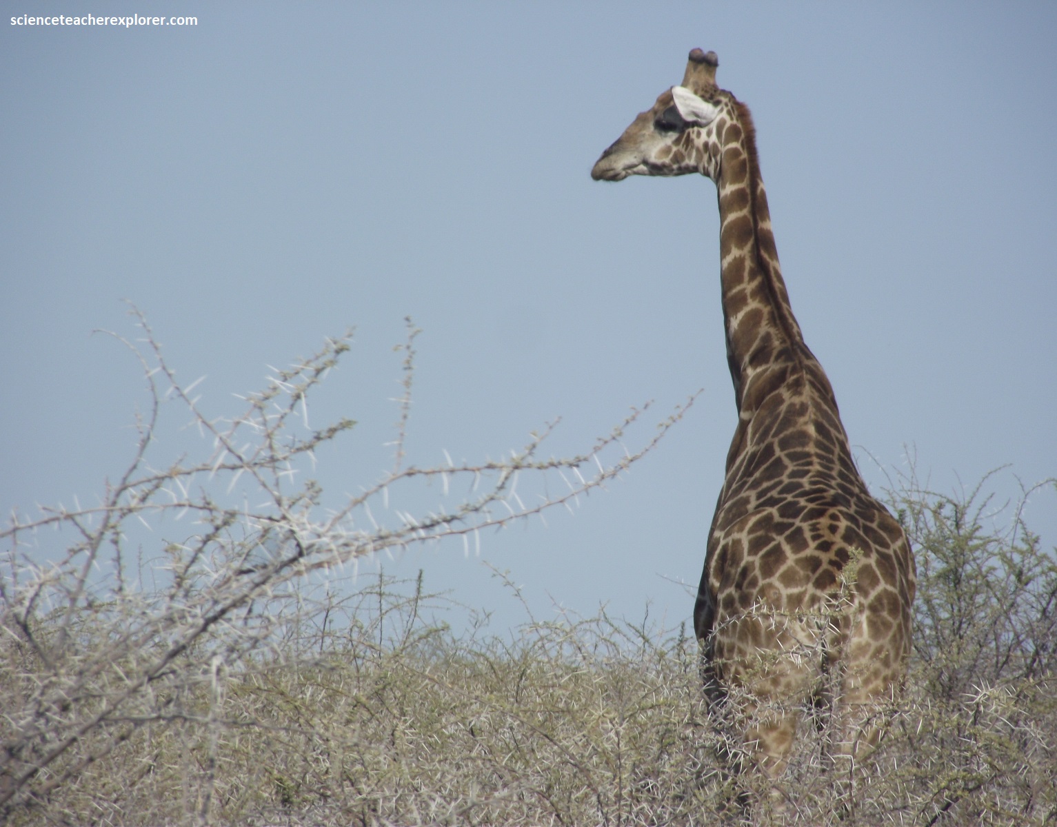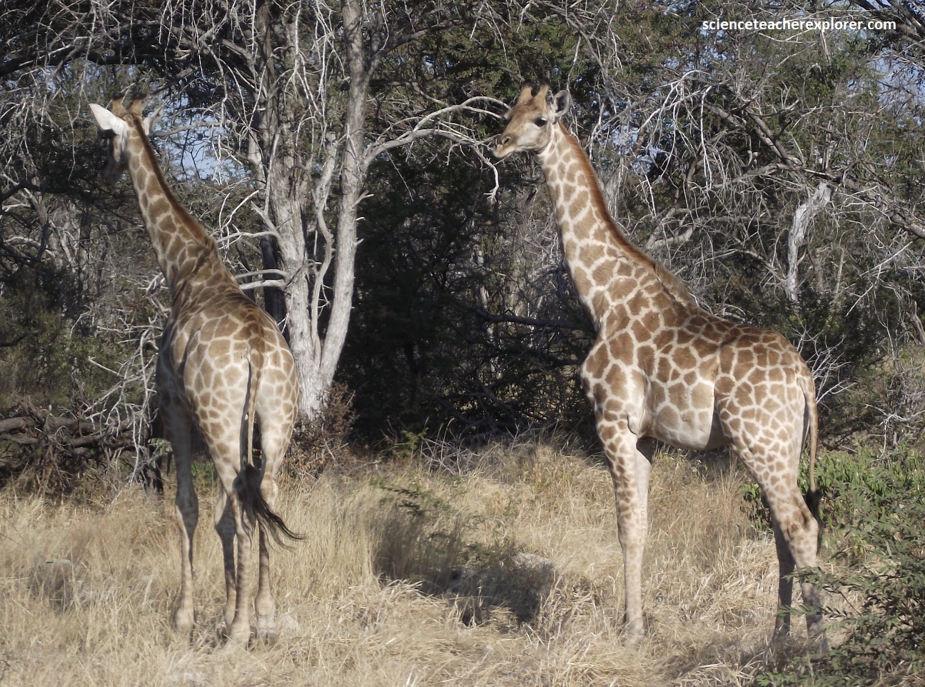 Pictured above, the Angolan giraffe (Giraffa giraffa angolensis) is a subspecies of the Southern Giraffe that is found in northern Namibia. This subspecies has large brown blotches with edges that are either somewhat notched or have angular extensions. The spotting pattern extends throughout the legs but not the upper part of the face. The neck and rump patches tend to be fairly small. The subspecies also has a white ear patch. The male giraffe moves longer than the female giraffe and also it has longer average daily movement (5.64km compared to 1.87km in 180 days during the dry season).