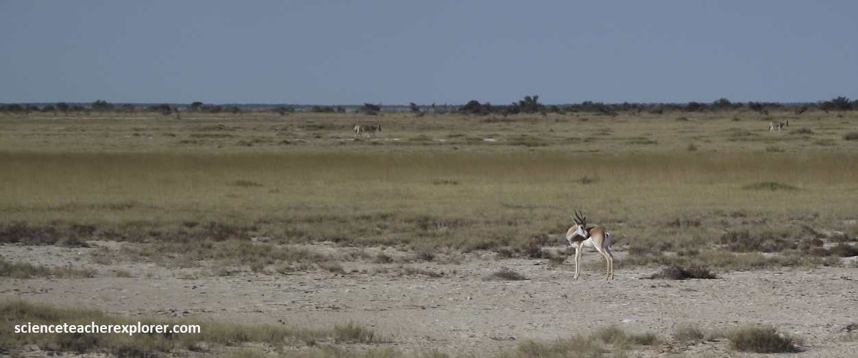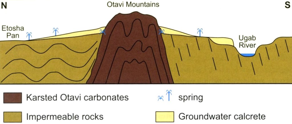 However, the Otavi mountainous region, composed of dolomitic rocks, acts as a source of groundwater that flows north into the central Etoscha Basin, providing the needed springs for wildlife to drink, (picture below).