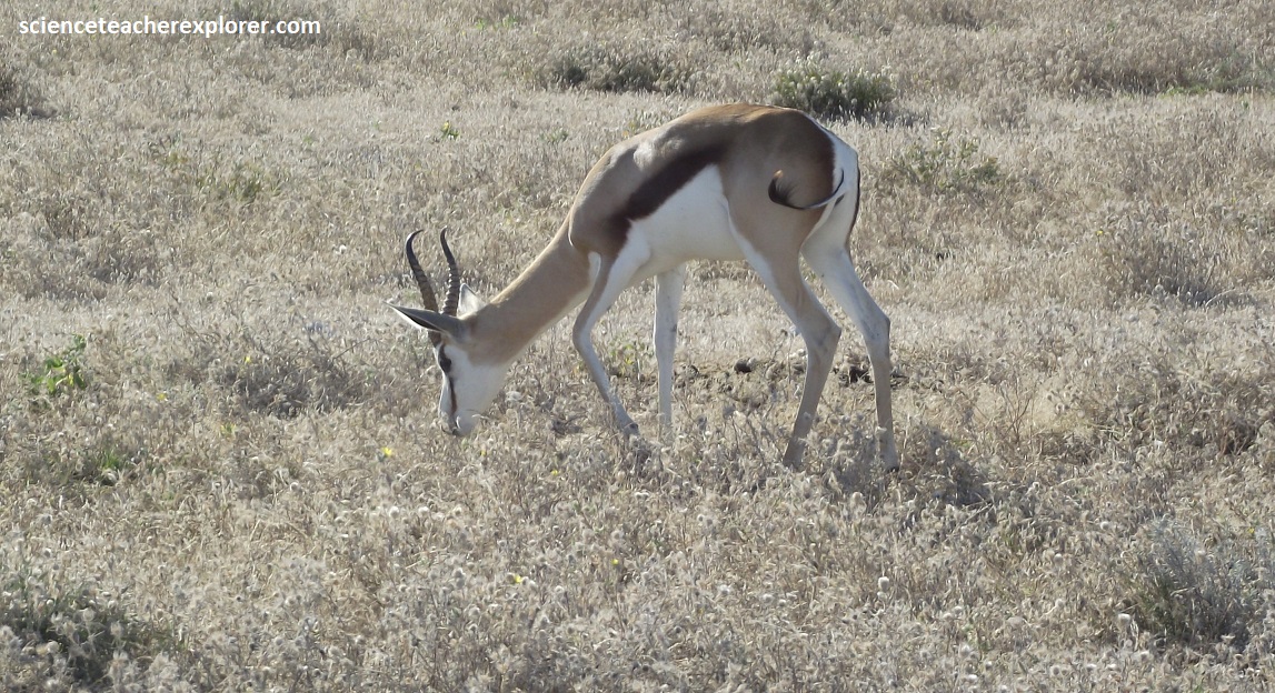 Pictured above, the Springbok (Antidorcas marsupialis) are known for their speed (88 km/hr.) and “pronking” behavior, (high leaps of 2m when excited or alarmed), and can be seen grazing on the plains, especially near waterholes during the dry season. After rains, larger herds gather and migrate to the green pastures. I believe they are among the most common antelope in Etoscha.