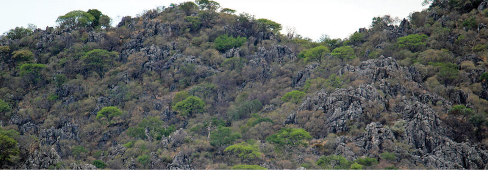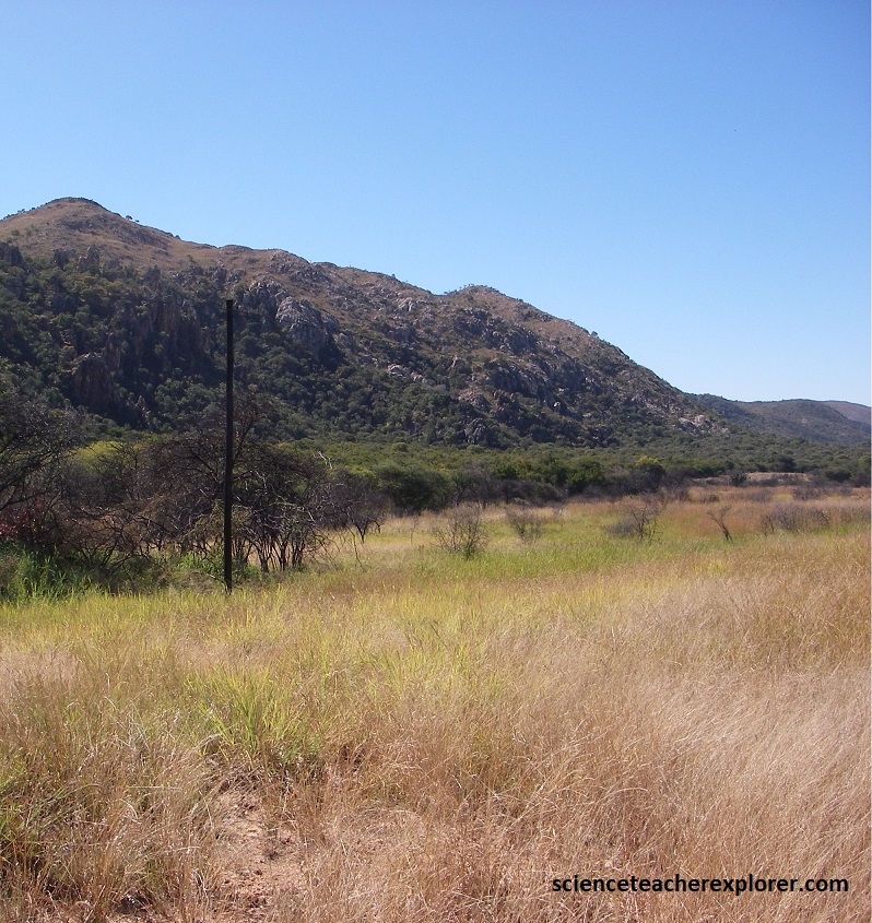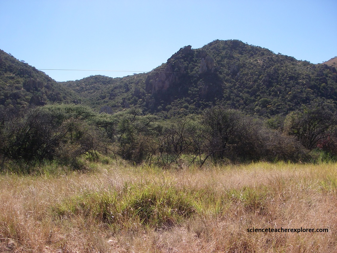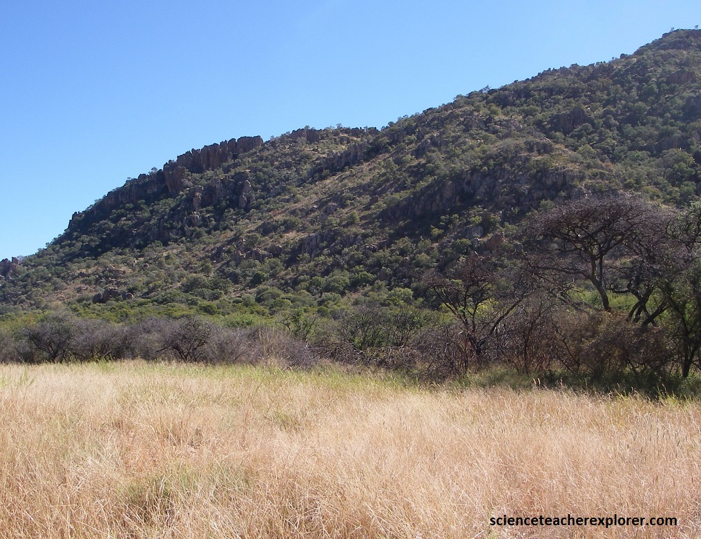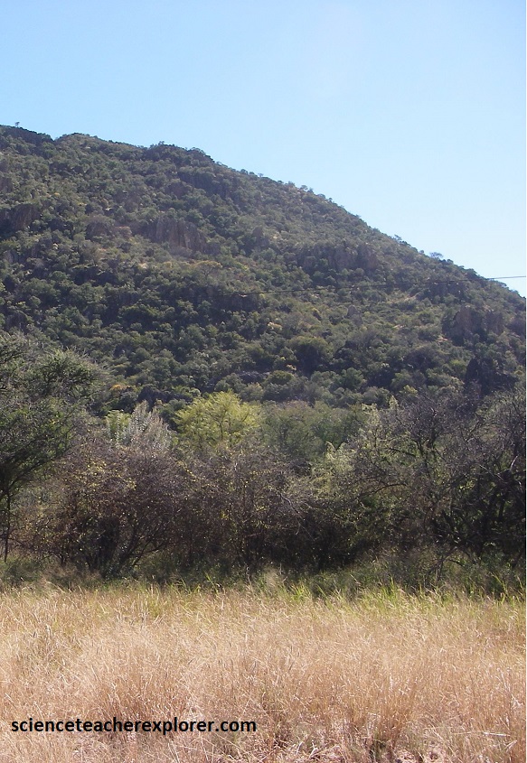 Then, approximately 650 million years ago the Congo and the Kalahari Cratons drifted towards each other, creating a mountain building event, (orogeny). Therefore, some 540 million years ago, the sediments of the small sea, situated between the cratons, were pushed together into a huge folded mountain range, called the Damara Orogeny. The remnants of this carbonate mountain-chain can be seen in the light-colored, heavily overgrown high rock formations within the Otavi Mountainland, (Pictured below on hwy. B1 between Tsumeb & Otavi).