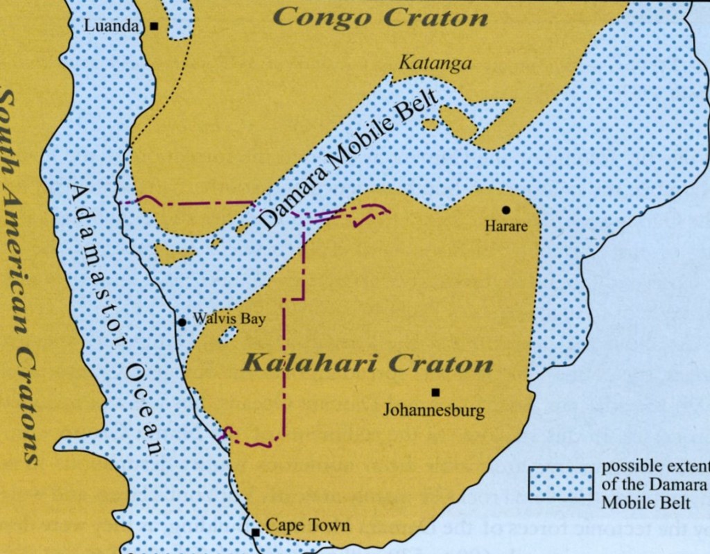Between the Kalahari Craton & Congo Craton, a branch of the sea extended in a northeasterly direction from Walvis Bay to the ‘copper belt’ in Zambia, (called the Damara Belt and imaged below).