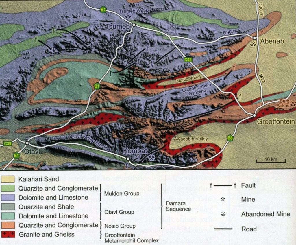 Actually, the Otavi Mountainland became famous mainly from a mineralogical and mining point of view. The Tsumeb deposit, (under the town of Tsumeb), contains an extraordinary diversity of various ores of lead, copper and zinc. In addition, silver, arsenic, antimony, cadmium, cobalt, germanium, gallium, iron, mercury, molybdenum, nickel, tin and vanadium occur. It is situated in the northern part of the Otavi Mountainland in slightly folded, karstified dolomite rocks of Damaran age.