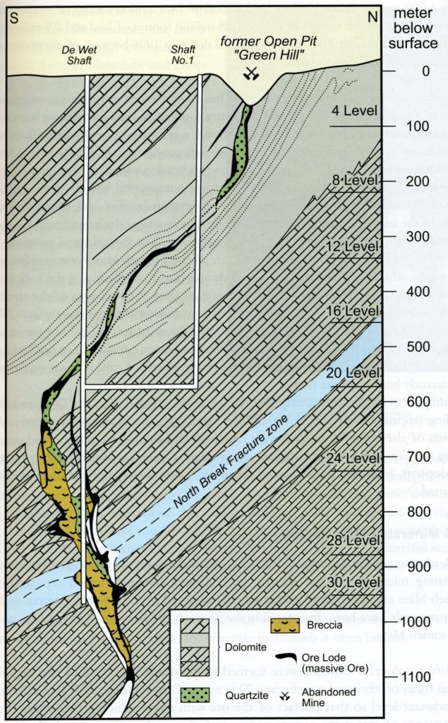 The ore-body forms a steep sub-vertical pipe, with a proven drilled depth of nearly 1,800m. From 1905 to 1990, a total of 24.6 million tonnes of ore were mined from which 1.7 million tonnes of copper, 2.8 million tonnes of lead and 0.9 million tonnes of zinc were produce. The mine was closed in 1996.
