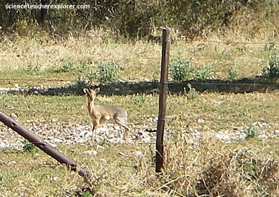 We got to the Ghaub Cave on the D 2863 graveled road, which branched off from the B 8 highway in the small mining town of Kombat. We drove about 30km, when we saw the signpost of ‘National Monument Ghaub Cave’. Along the way, near an active spring, we saw this amazing little animal, pictured above, called the Damara Dik dik, (Madoqua kirki). This extremely rare and protected species is only 38.6 cm high and has a mass of 5.1 kg. Only the rams have horns which can attain a length of 8.0 cm. The Dik dik usually inhabits the dense shrub and thicket, which provide shade and protection from predators. We were very fortunate to see one of these.