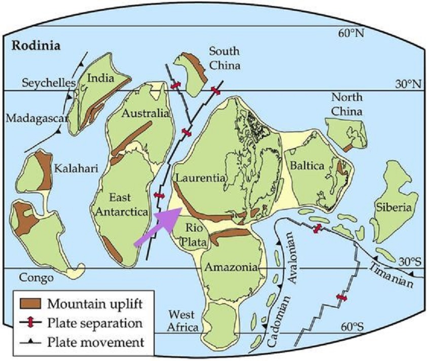 From the beginning of the first mainland formations of Africa, approximately 750 million years ago, only two landmasses, the Kalahari Craton of the East and the Congo Craton in the North, (part of the Rodinia supercontinent) , lay like islands in the huge ancient ocean. [Around 750 million years ago, the supercontinent Rodinia began to break apart, a process that likely contributed to a period of global cooling or even “snowball Earth” events. As Rodinia fractured, new rift valleys formed, and the breakup increased the amount of shallow seas and continental margin, which enhanced the burial of organic carbon. This process removed CO2 from the atmosphere, causing the climate to cool.