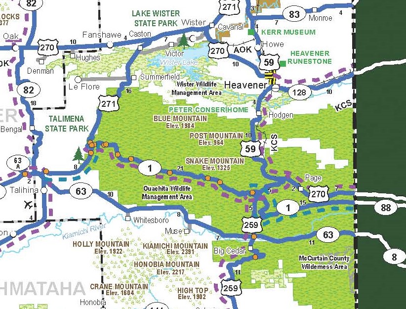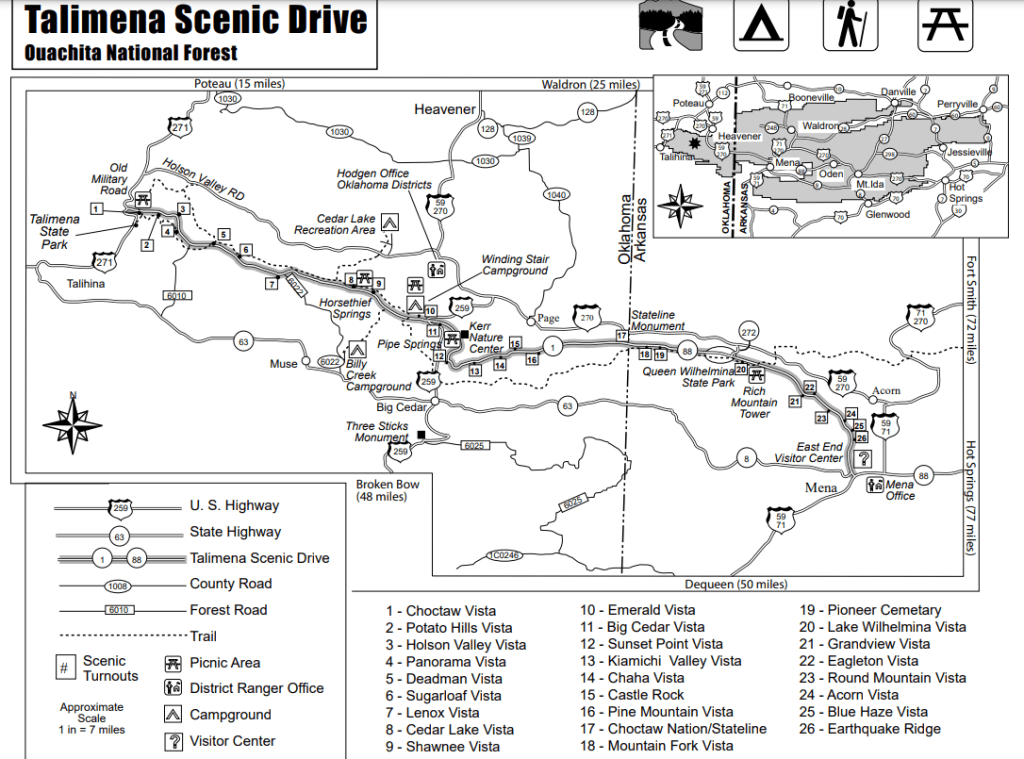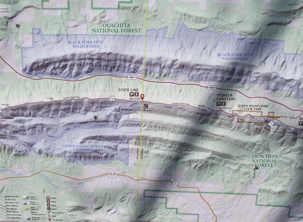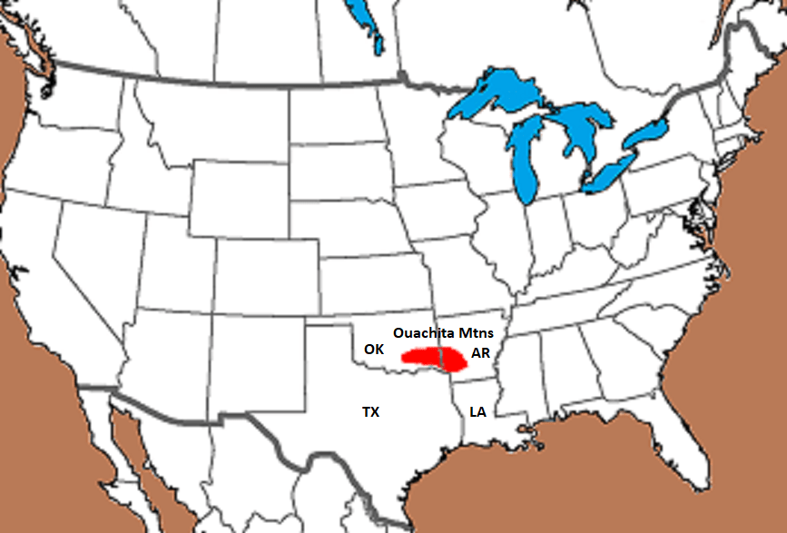 I gained access to the Ouachita Mountains by driving the Talimena Scenic Byway, (AR-88/OK-1), from Mena, Arkansas to US-271 in Oklahoma. Additionally, I trekked the nearby Heavener Runestone Park in Oklahoma.