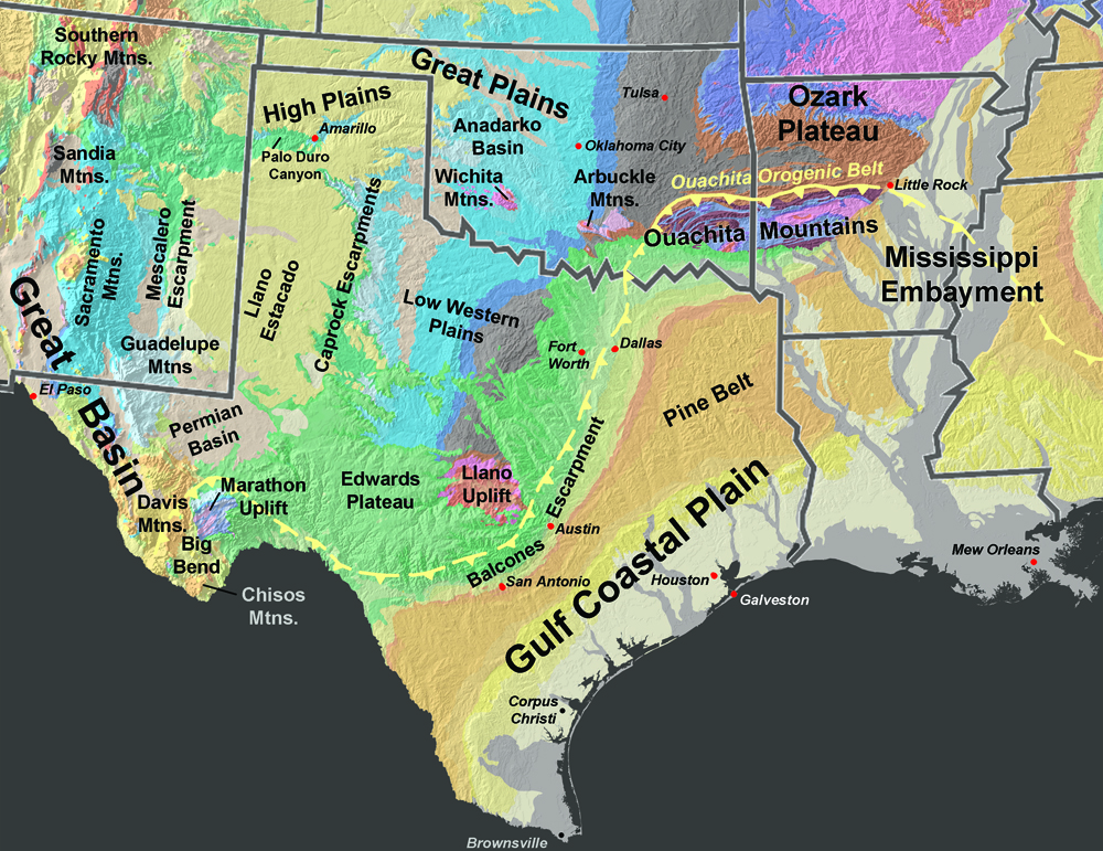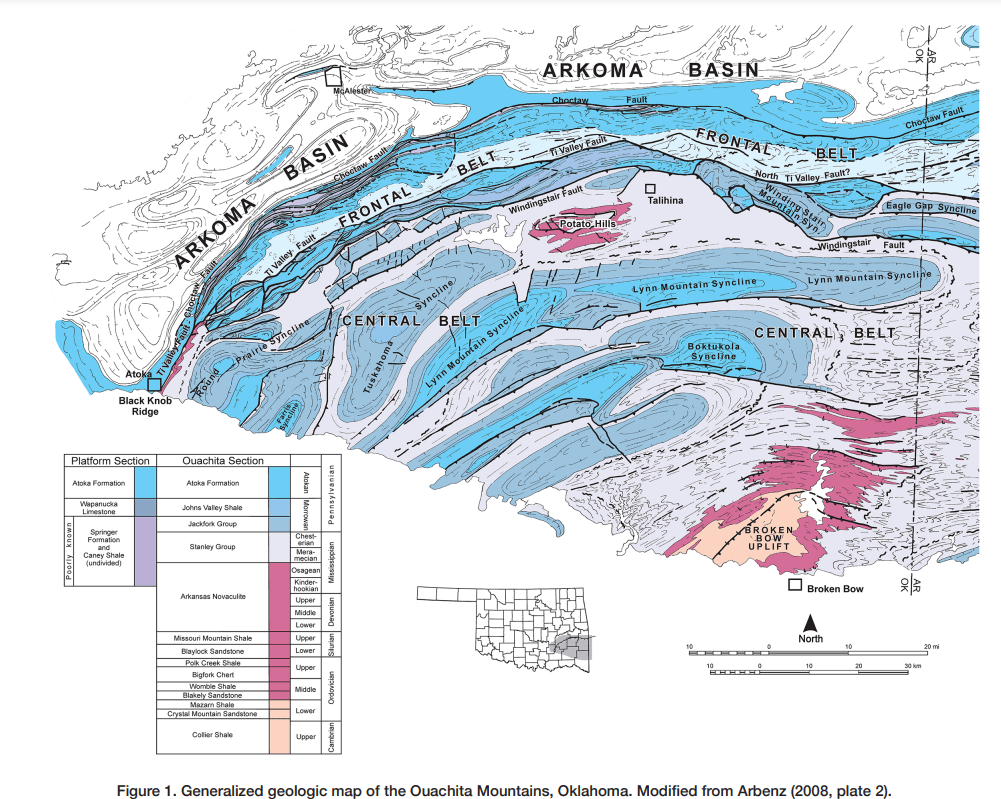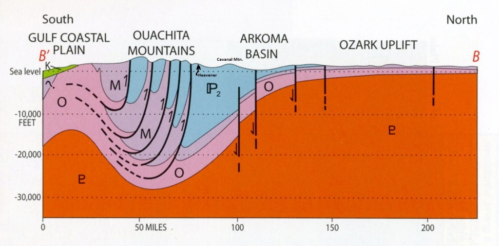 The collision between the plate is called the Ouachita orogeny and produced the Ouachita Mountains in south-eastern Oklahoma.