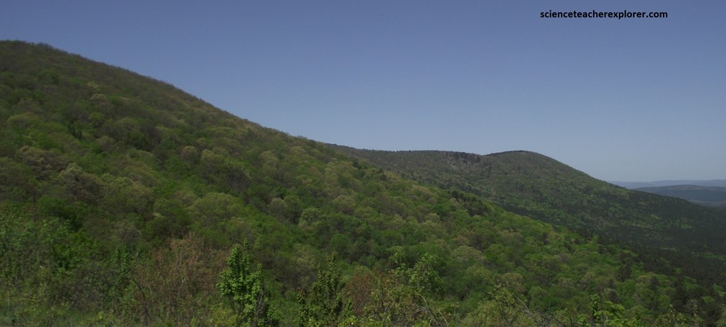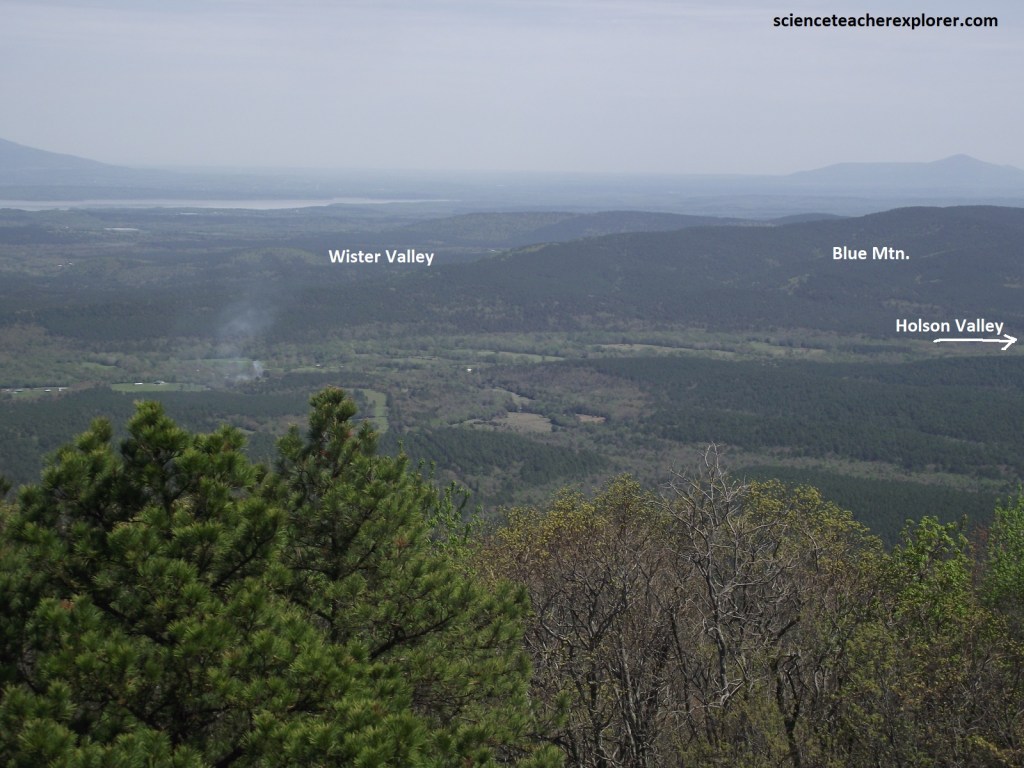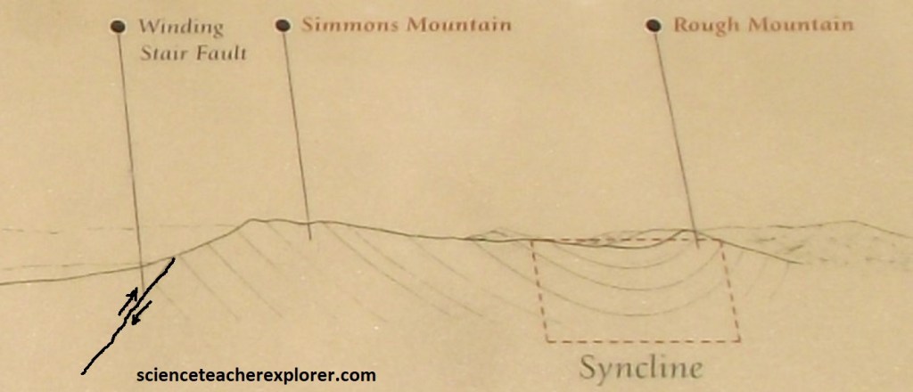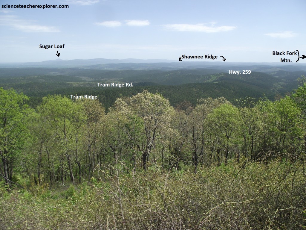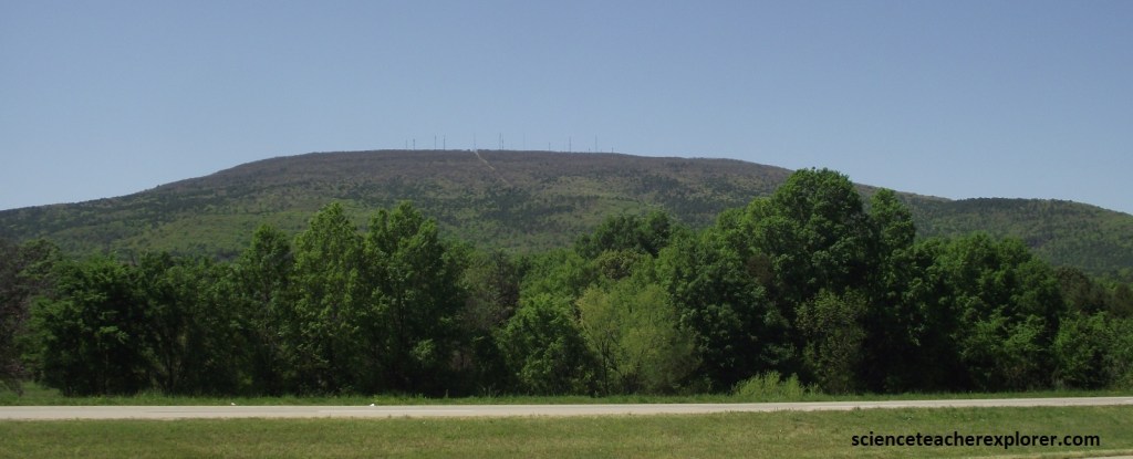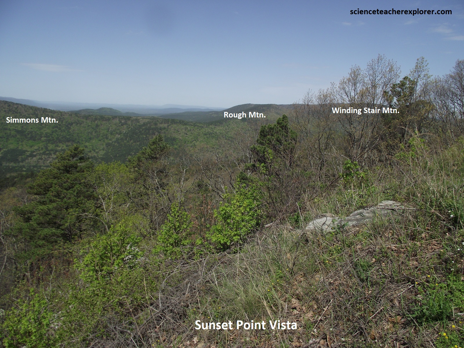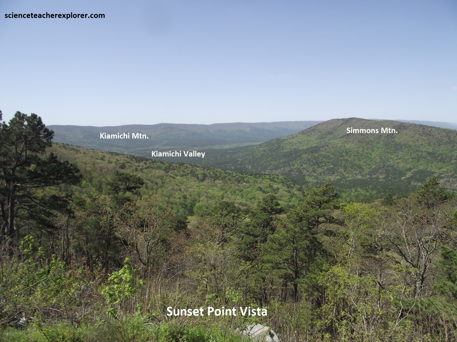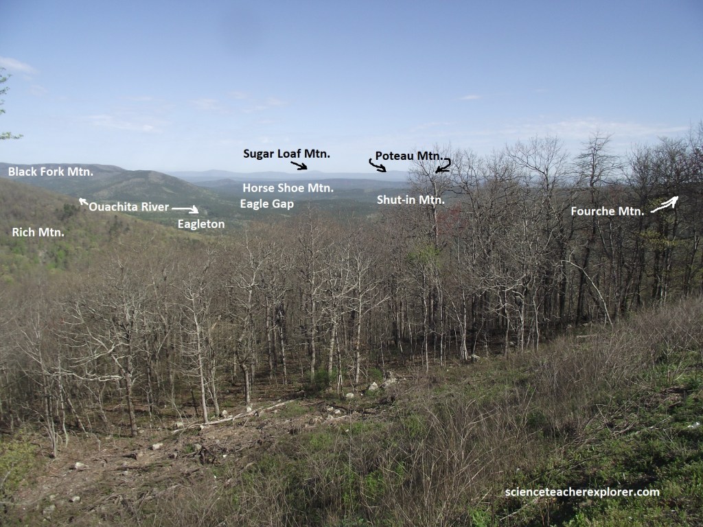 Pictured above, the curved ridge is formed by Simmons and Rough Mountains. The depression between these two peaks is part of a large syncline. Synclines are large folds in the earth formed when the earth’s crust was compressed and bent. The Ouachita Mountains, a “fold-and-thrust” mountain range, were formed when rocks far to the south were shoved hundreds of miles over rocks in the north. As mentioned above, the rocks here were once part of a deep sea floor in Texas.
