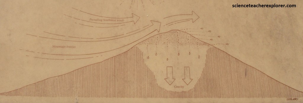 Despite more than 153 cm of rain a year, the top of this long mountain ridge that I’m driving along has more in common with a desert than a rainforest. The soil texture, slope, and gravity act like a giant sieve. Rain water disappears almost as quickly as it falls, leaving little moisture near the surface. Wind constantly blowing evaporates moisture clinging to any surface. Plants that live here must be able to protect themselves from its dehydrating effects with special root and leaf structures.