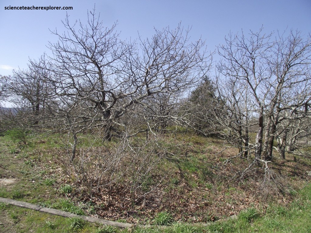 Pictured below, natural force sculpted the trees into a miniature forest. Strong, drying winds and ice storms sheer and prune relentlessly, forcing survivors to stoop and bend to their will. The most common tree, the white oak, (Quercus alba), is not normally a dwarf. Under more favorable growing conditions in the valley below, any one of these dwarfs may grow into 38m giants.