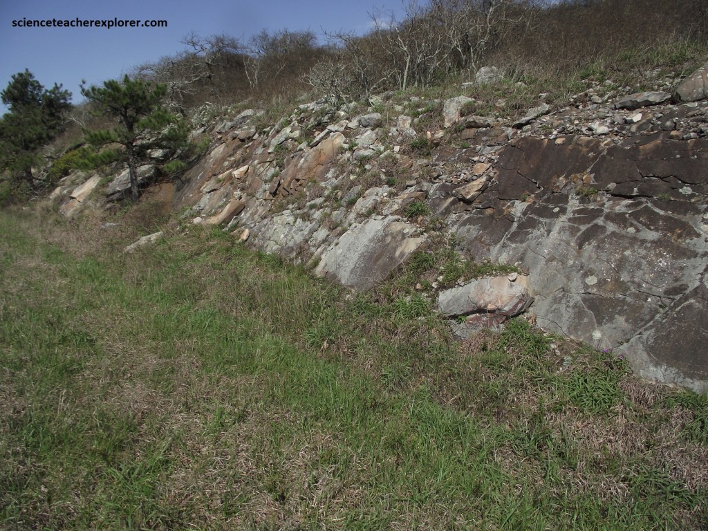 Pictured above, the Pennsylvanian Atoka Formation appears on the ridge-top near Castle Rock Vista. It is a Turbidite sandstone that was deposited in deep ocean basins as fast-moving, turbulent, high-density clouds of sediment eroded off adjacent continental shelves. It was either shaken off the shelves by earthquakes or collapsed off over-steepened shelf areas at the front edge of advancing river deltas. This usually causes graded effect, (grain size getting finer upward through the bed). However, the Atoka Formation here appears to be not graded because the sediment in the source area was fine grained. The plane-parallels laminated beds in the upper part of the sandstone grade into the overlying shale.