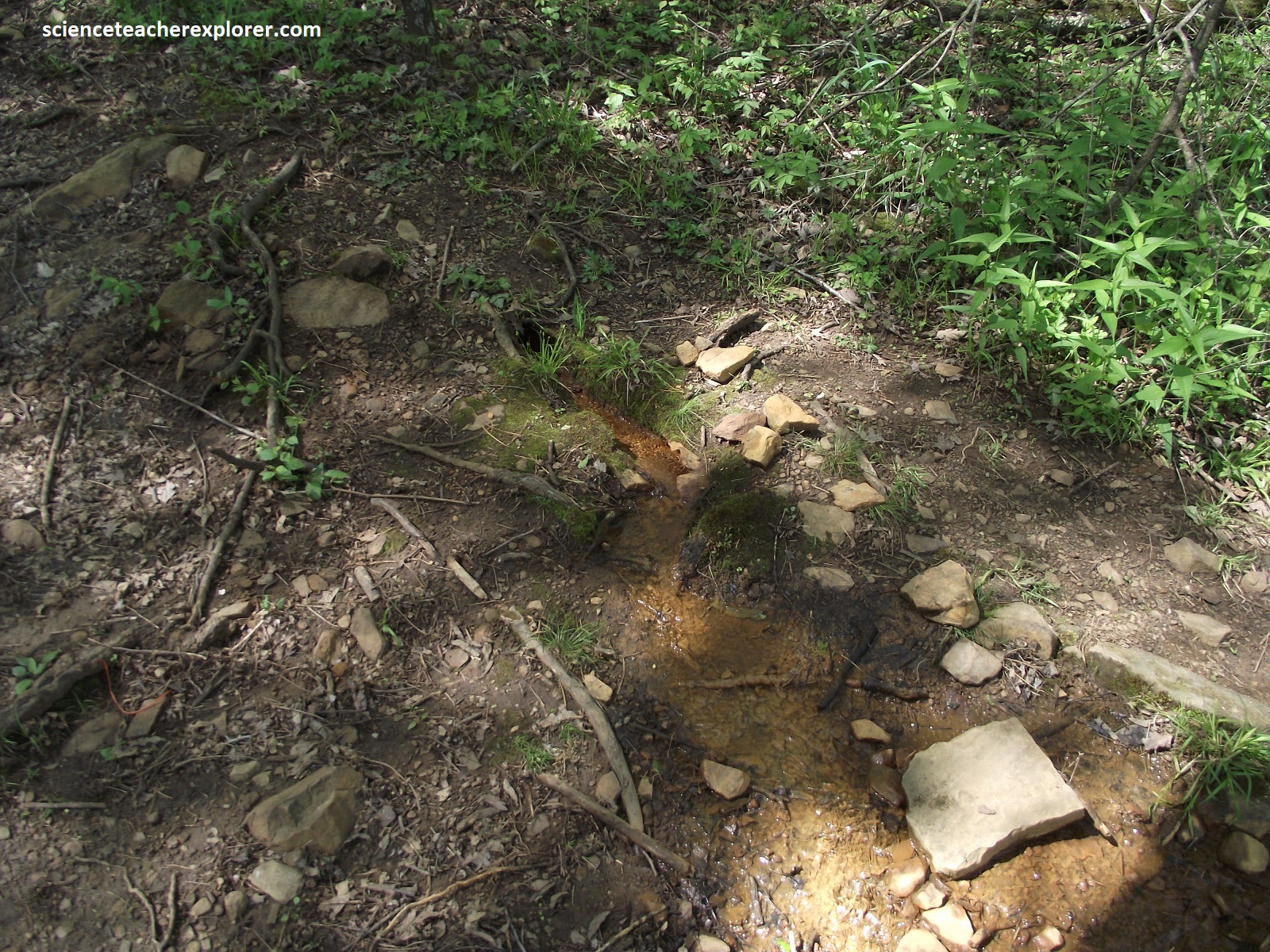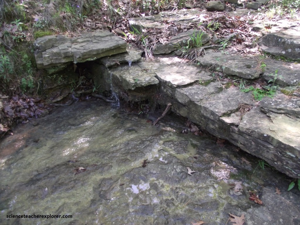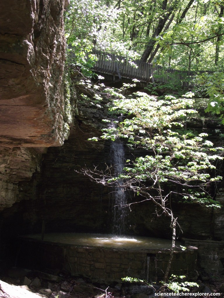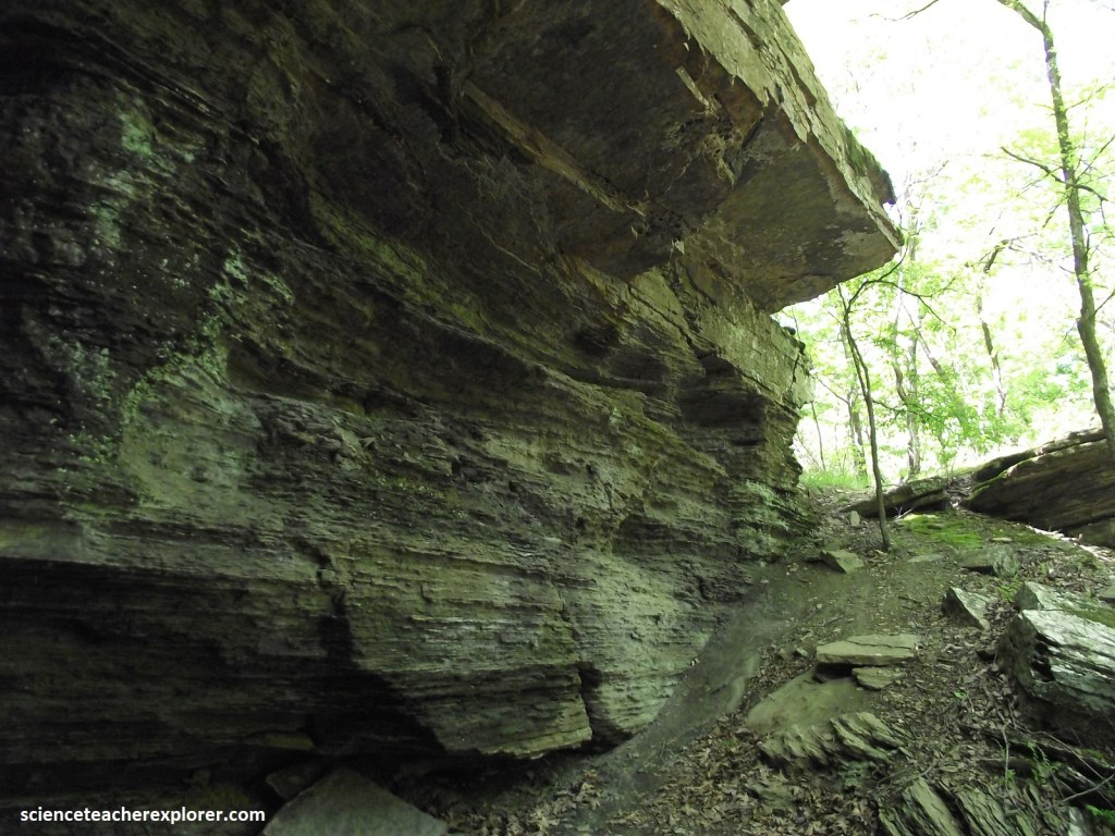 Overall, the outcrop at the waterfall along the trail coarsens and thickens upward, from shale at the bottom up through siltstone to sandstone at the top. Pictured above and below, the lower, more easily eroded shale is being undercut below the harder sandstone of the overhang.