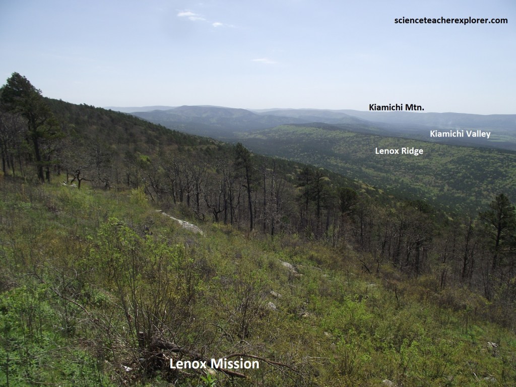 The valley-and-ridge character of the Ouachita Mtns. is caused by interbedded thick, hard sandstones that form the ridges and relatively soft, easily eroded shales that form the valleys. In the Talimena Scenic Byway part of the mountains, the ridges and valleys mostly trend east-west, parallel to the faults that formed the mountains, (pictured below).
