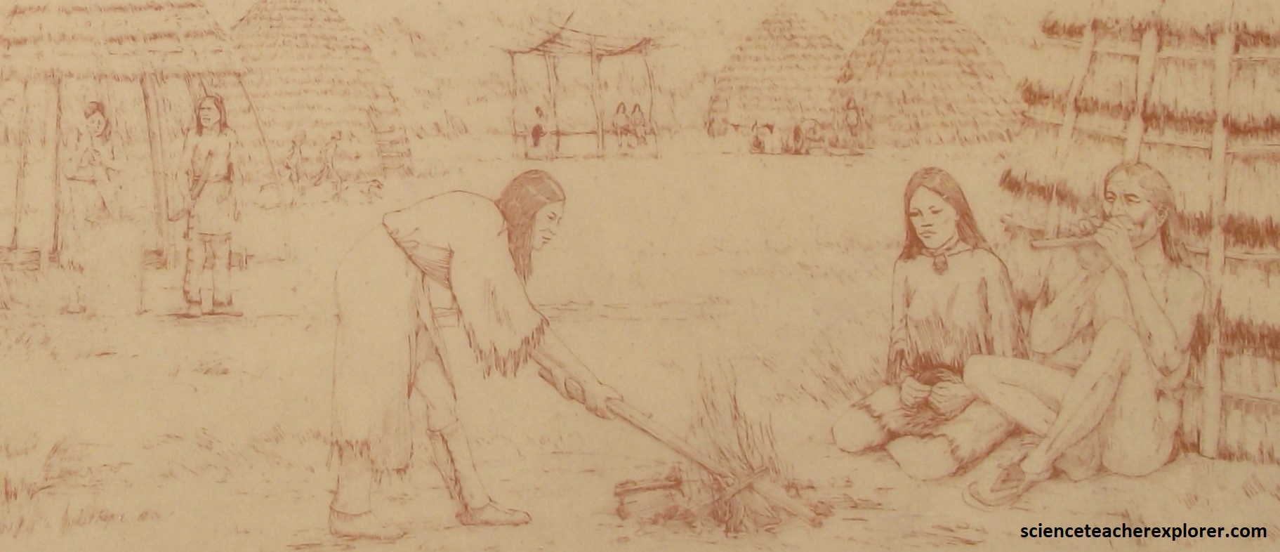 Pictured above, evidence dating back to 1500 B.C., suggests prehistoric people lived in Wister Valley. Sustaining life required daily hunting, and the gathering of wild plants. As their cultures evolved or necessity demanded, they began to cultivate plants such as corn and squash, leading eventually to full-scale farming. Evidence of these people disappears after 700-800 A.D.. In 1719, Bernard LaHarpe, an early explorer, wrote in his journal that this area was abandoned except for an occasional Native American hunting party.