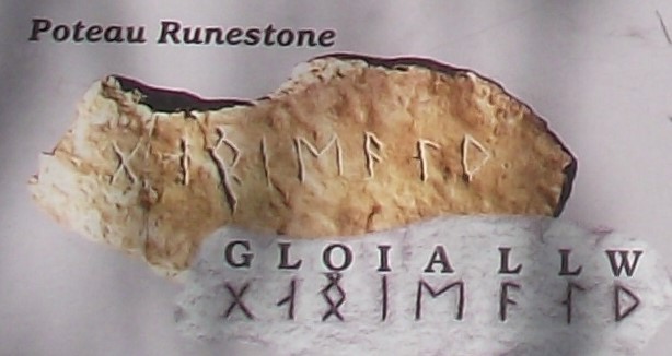 Additionally, it is reported that the Heavener Runestone was seen by a Choctaw Native hunting party in the 1830s. Signed statements have been made by territory residents who saw the stone as early as 1874. Four other runestones have been found in the Poteau and Heavener, Oklahoma area. A fifth runestone was found near Shawnee, Oklahoma. Using the Elder Futhark alphabet, Dr. Nielson translated the Poteau Runestone as G-L-O-I A-L-L-W meaning “Magic or Protection to Gloi”. Gloi is believed to be a nickname for Glome. Dr. Nielson translated the Shawnee Runeston as the Scandinavian name MEDOK. The Poteau and the Shawnee Runestones are exhibited at the Kerr Museum in Poteau, Oklahoma. { The images of Dr. Nielson, the Poteau Runestone and the Shawnee Runestone below were taken from an interpretive sign, on-site}.