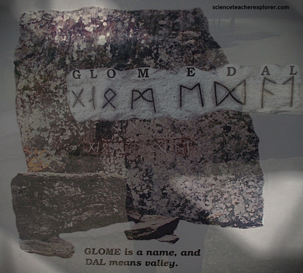 Further down the trail from the waterfall is a 4m by 4m upright stone slab with carving that look like an ancient alphabet, or 8 Nordic-Runes representing a boundary marker for “Glome Valley”. Some believe that the runestones were left by Viking explorers in 1000 A.D. Below is are pictures of the runes within it’s protective structure.