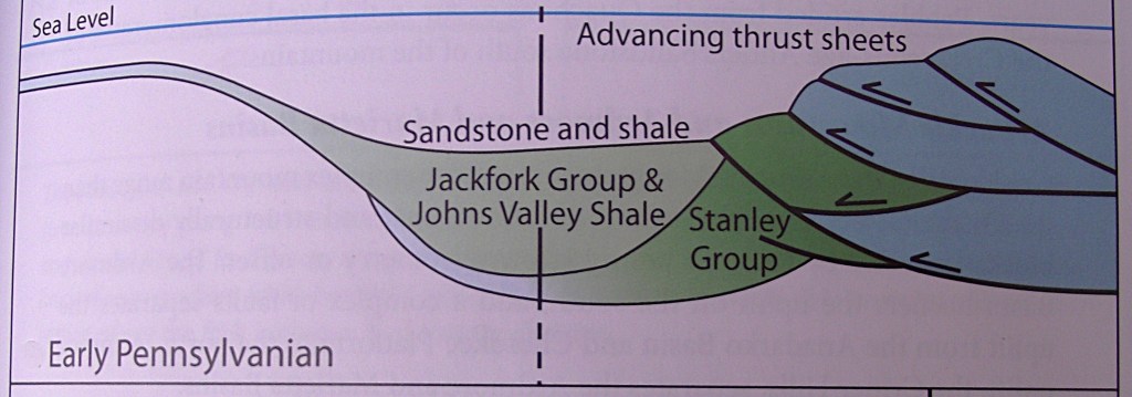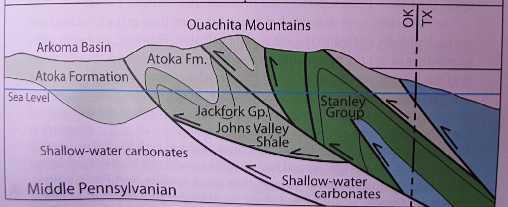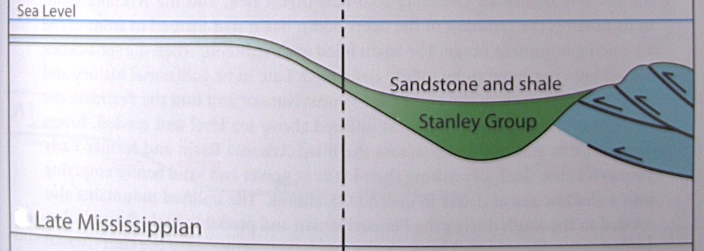 Imaged above, the initial phase of the orogeny was the deepening of an ocean basin, called the Ouachita trough, in what is now northeast Texas. The basin accumulated as much as 330m of Middle and Late Mississippian deep-water deposits, (Stanley Group), whereas most of Oklahoma same-aged units to the north on the continental shelf are only 30m thick, (Caney Shale). Most of the Stanley Group sandstones and shales form turbidites, (a deep-marine) sedimentary deposits characteristic of active tectonic settings.
