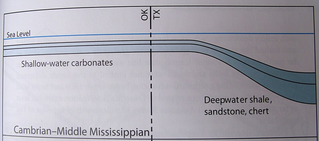 Imaged above, as the trough migrated north into Oklahoma, it caused the Late Mississippian-Early Pennsylvanian continental shelf and slope to migrate north as well, mildly deforming them.