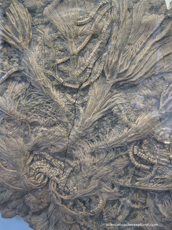 This display of fossil crinoid and coral of impressively large proportions, is an amazing giant natural association of a concentrated group of large, complete prehistoric SEA LILIES of the species Scyphocrinus elegans with a rare fossil coral colony. The slab was formerly the bottom of the 460 million year ago Silurian sea where a number of these creatures died and became buried still in their original articulated positions as they were when once alive. Amazing!