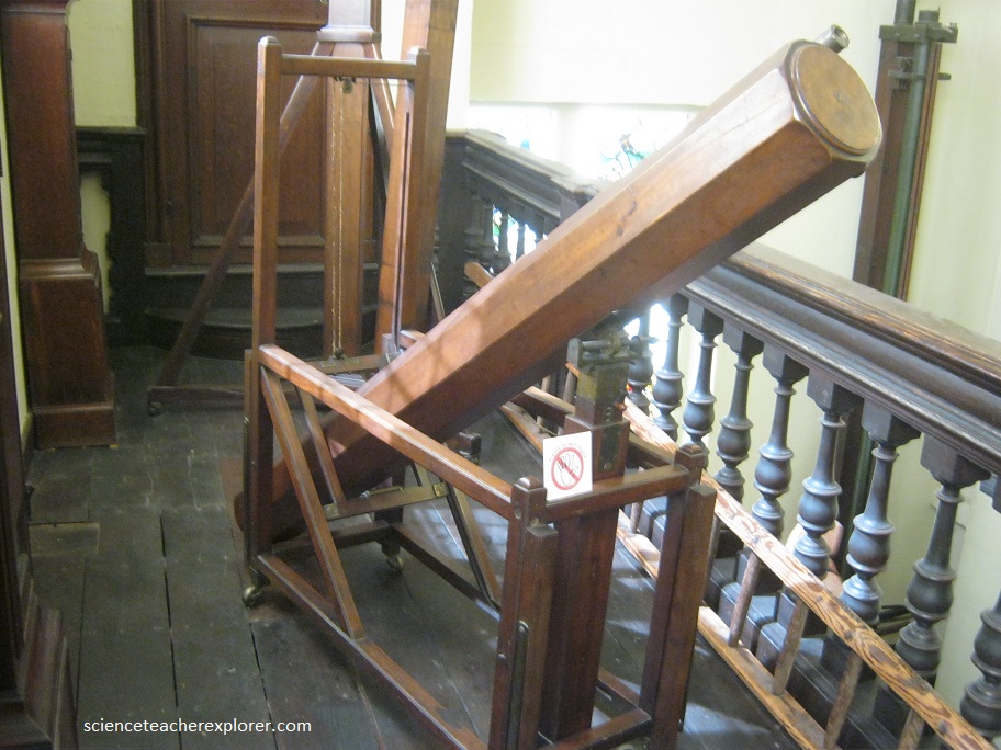 On the stairway, this instrument is a Newtonian reflector by William Herschel, famous for discovering the planet Uranus and building very large reflectors. this is his 7-ft (focal length) model, the type used in the discovery of Uranus.