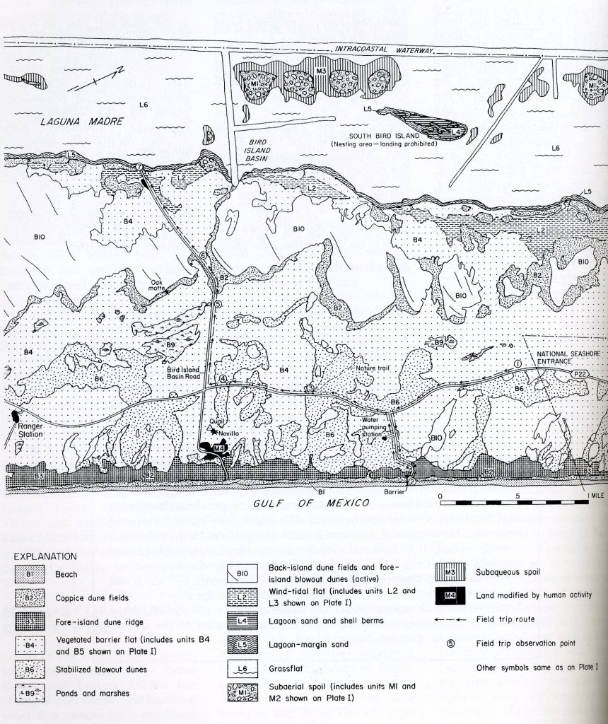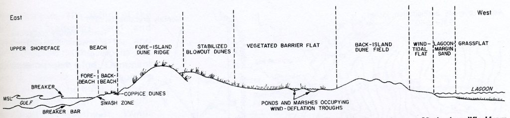 Natural processes at work on Padre Island have produced a predictable pattern of environments across the island, which varies in width from about 1-4 km. A common sequence of environments from the Gulf to Laguna Madre includes the sand and shell beach; a stable ridge of fore-island dunes, vegetated flats with scattered, stabilized, grass-covered dunes; the barren fields; and the featureless plains of wind-tidal flats.
