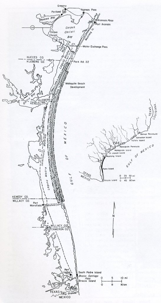 Padre Islnd is one of the southernmost links in the chain of barrier islands and peninsulas along the curving Texas coastline. (imaged below). Broken only by a manmade channel, Mansfield Channel, this island extends southward from Corpus Christi to Mexico.