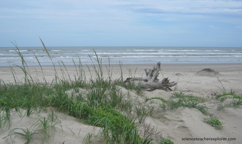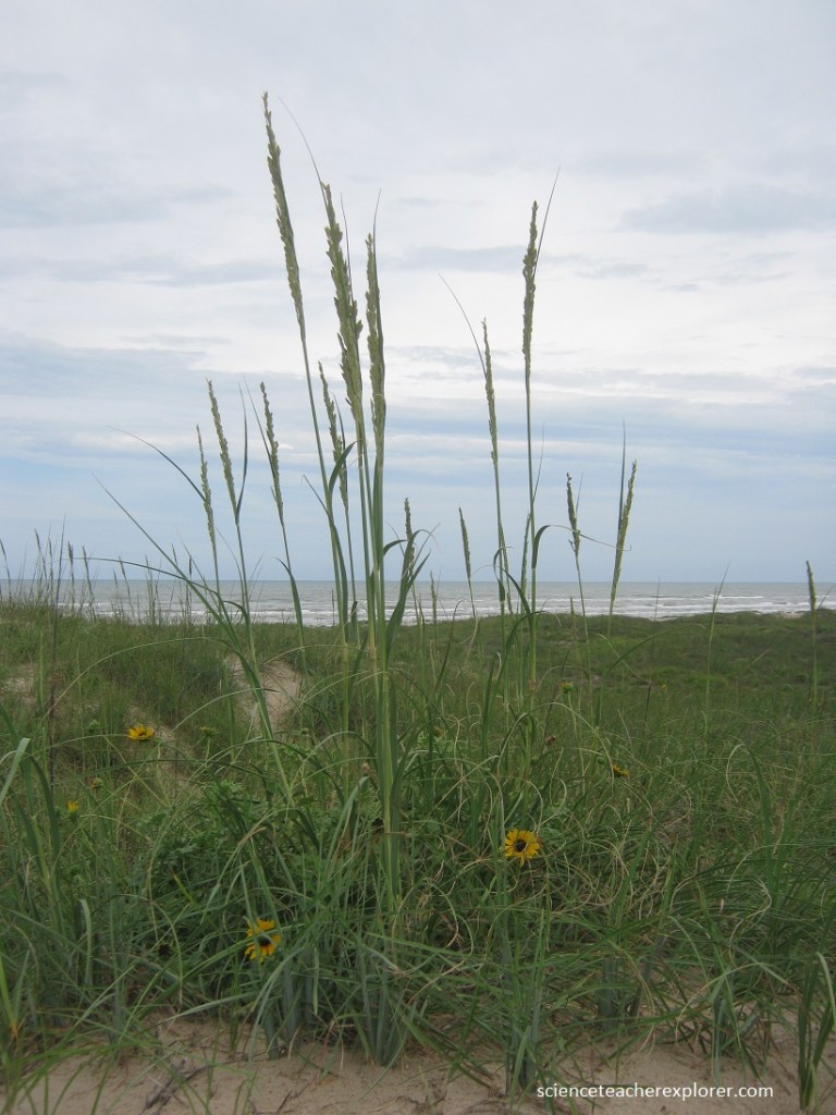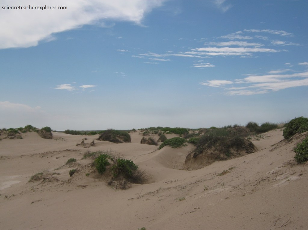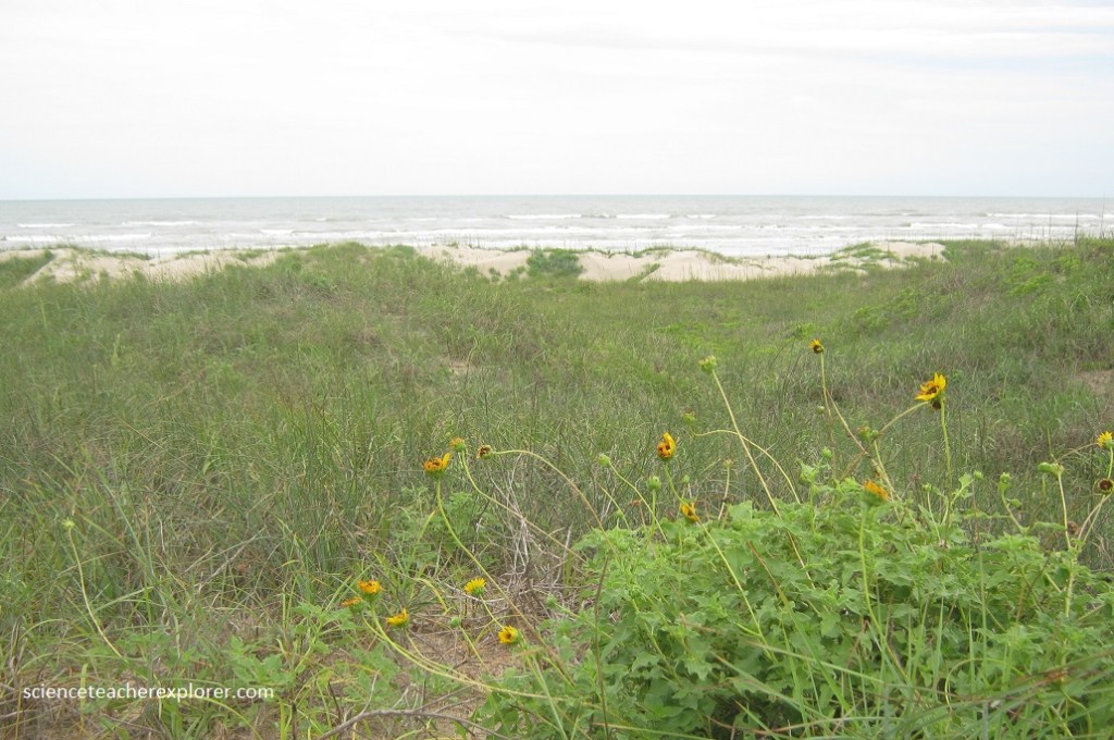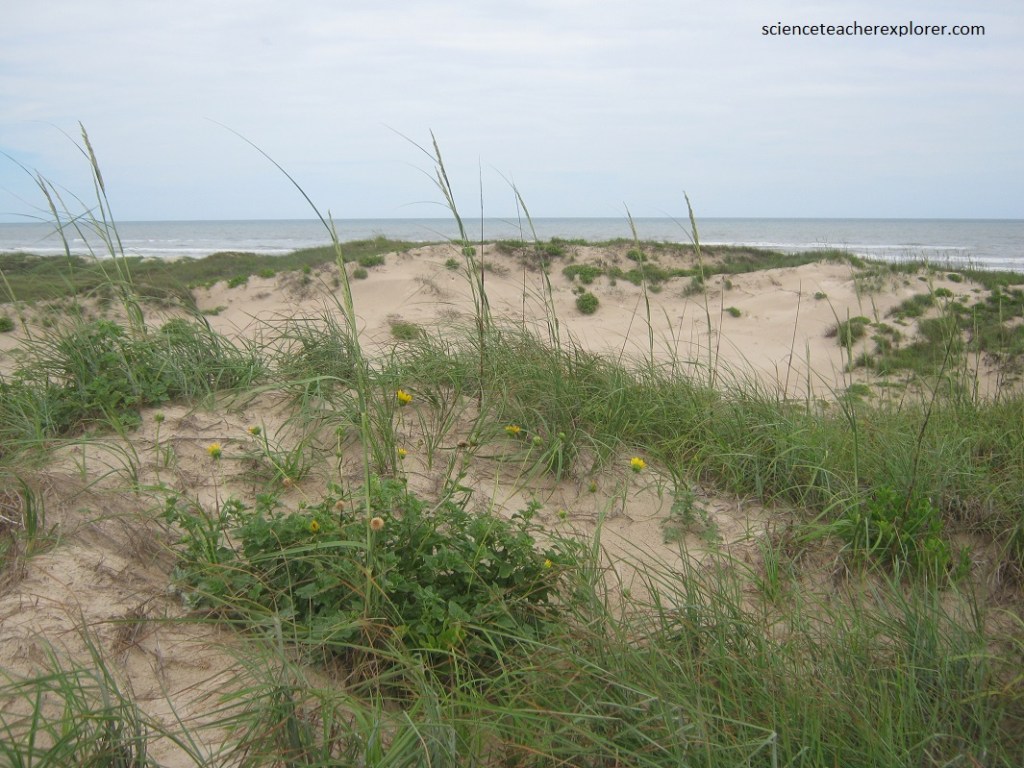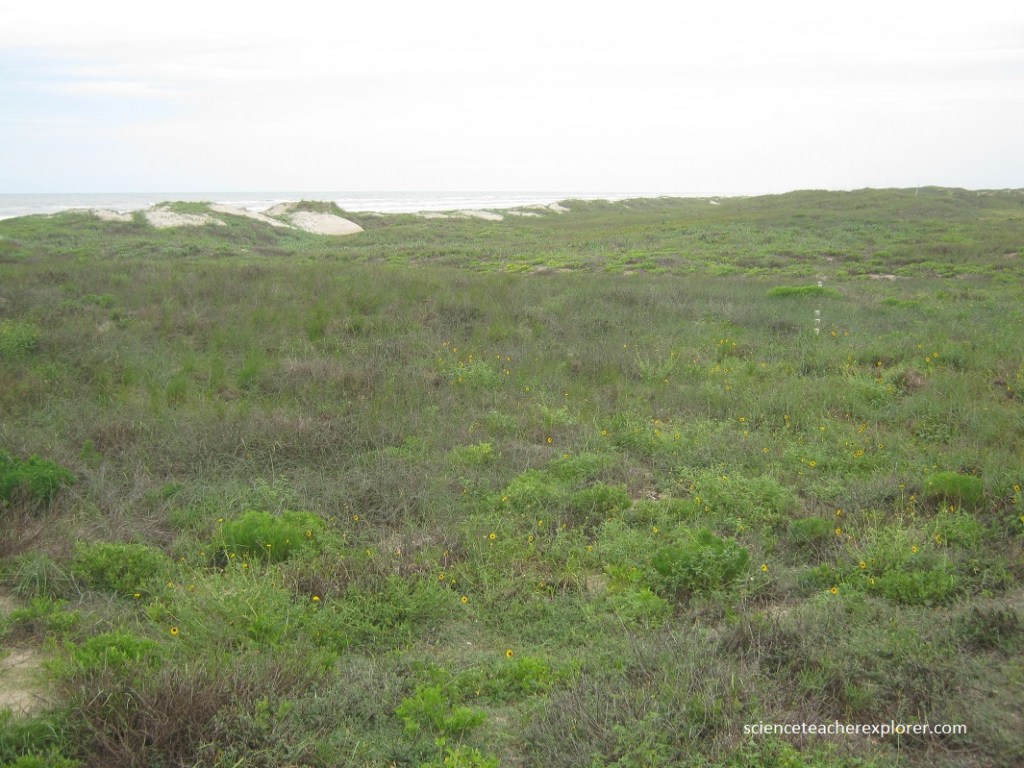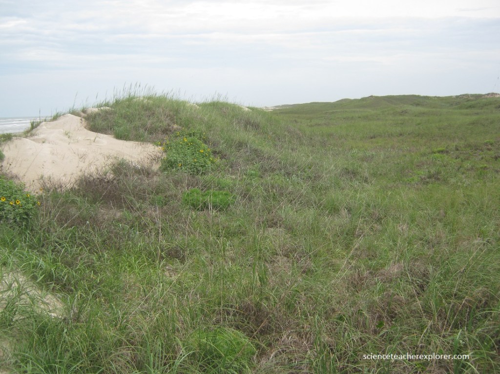 Pictured above and below, this dune ridge protects the barrier island from the full force of hurricane wins and storm surges that strike the Texas cast. Maintenance of a healthy vegetative cover on the dunes is important, as it prevents the sand from blowing inland and leaving gaps in this natural barricade.