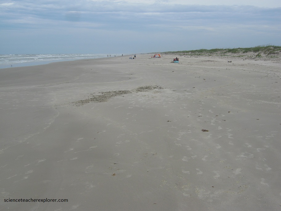Pictured above, the Malaquite beach sediments consist of fine sand with very little shell material. The profile (slope) of Malaquite beach is quite gentle compared with the profiles of some beaches south of here. The beach berm is low, and cusps are broad and widely spaced.