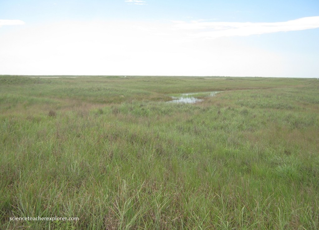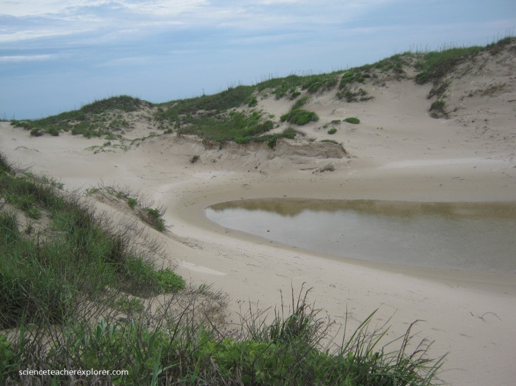 During hurricanes, the storm surge cuts through the fore-island dune ridge at low, weak points, scouring channels generally perpendicular to the shoreline. These “Hurricane Wash-overs” generally consist of a single channels up to 200 m wide through the dune ridge. On the barrier flats behind the ridge, however, wash-over channels split into two or more smaller channels. Ponds form in the deepest parts of the inactive wash-over channels between storms, (pictured below).