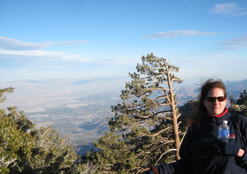 The San Jacinto Mountains are right triangular in outline. The northern margin is along San Gorgonio Pass, the east face looks down on Palm Springs and the diagonal is San Jacinto Valley. The highest peak is Mount San Jacinto, at 3700 m. The Range is really a single mountain block uplifted along faults, with movement occurring through the Pleistocene. The major fault that created the block is the San Jacinto fault, slicing northwest-southeast along the topographic diagonal of the mountain mass. Branches of this fault zone also define several linear valleys in the upland areas, ranging in elevation from 500 m to 1400 m. At the bottom of the tram the rise is to 1400 m within one horizontal mile. Pictured below, Becky is standing near to the top of Mount San Jacinto at 3400 m higher than the valley floor. (less than 7.3 horizontal kilometers distant). This scarp is one of the great mountain scarps of the world.