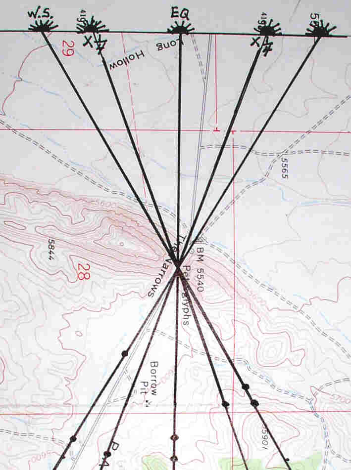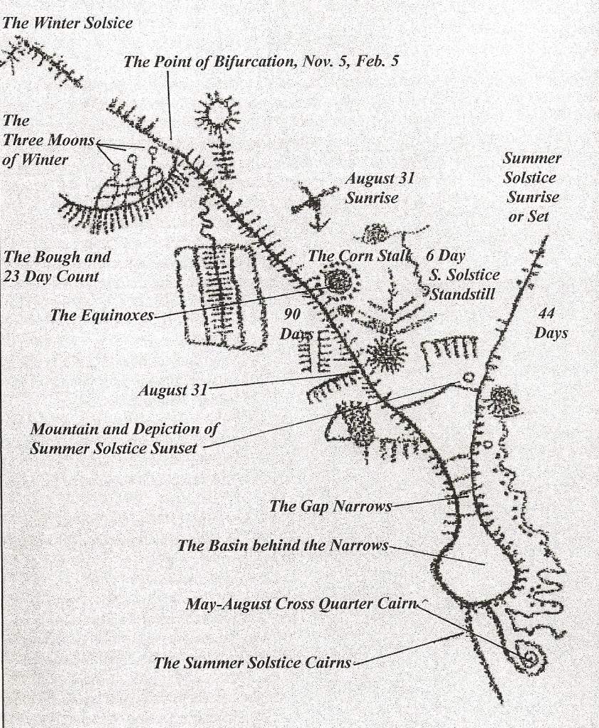After studying the Zipper Glyph since the late 1990s, Nowell L. Morris determined that the narrow neck of the Zipper Glyph represents the narrows of the Gap. With the help of Garth Norman, they determined that the lobe of the Zipper Glyph represents the valley just east of the narrows. As Garth Norman studied the lobe of the Zipper Glyph, he noticed that it was a map for markers found within the eastern valley. He discovered Cairns (rock piles) were set in positions in the valleys on the east and west side of the Gap Narrows by the Fremont about a thousand years ago to watch sunrises and sunsets on specific calendar cycle dates. These topographical correspondences made a strong case for the map-calendar interpretation, (imaged below).