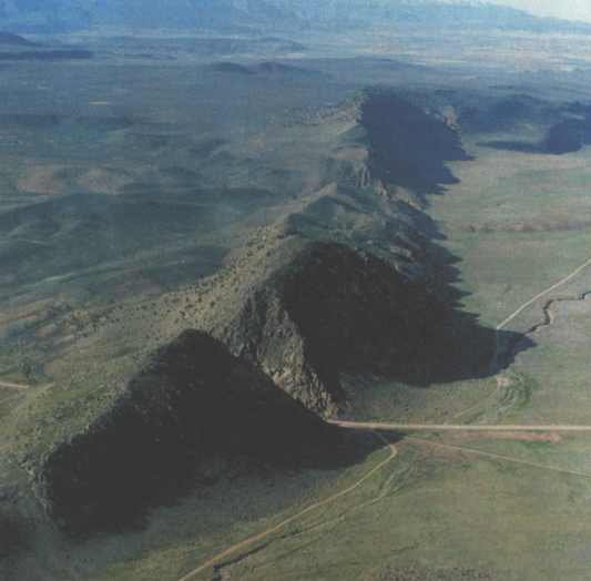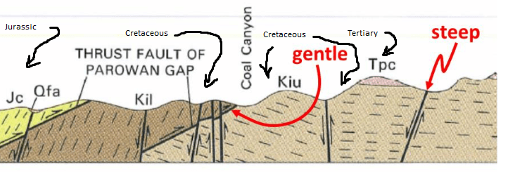 The Parowan Gap is a five-kilometer-long pass transecting the Red Hills between Parowan Valley on the east and northern Cedar Valley on the west. The rock strata exposed within Parowan Gap underwent low-angle thrust faulting and folding between 45 and 100 million years ago during the Sevier orogeny, a mountain-building period caused by dense oceanic crust in the Pacific Ocean colliding with and moving beneath the lighter continental crust of North America.