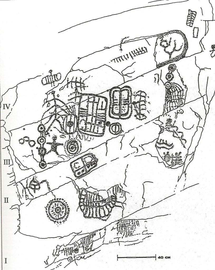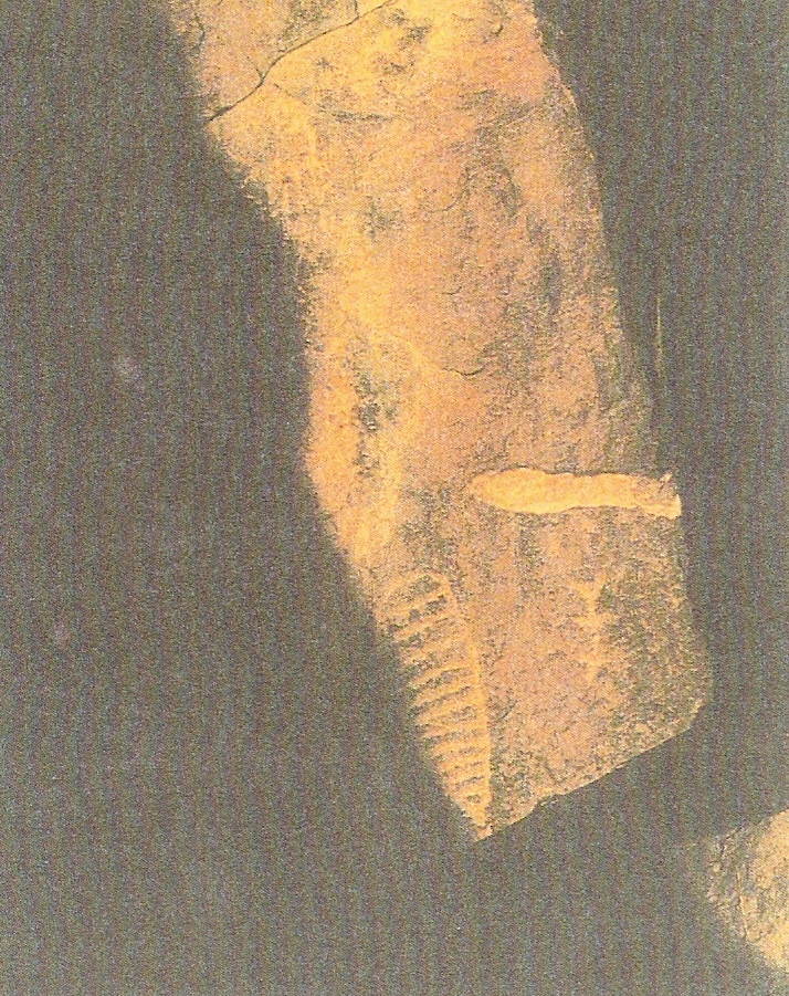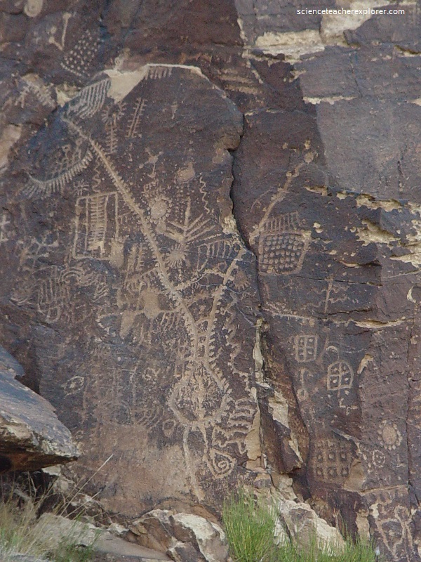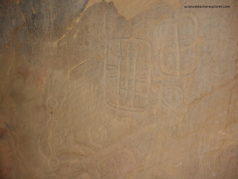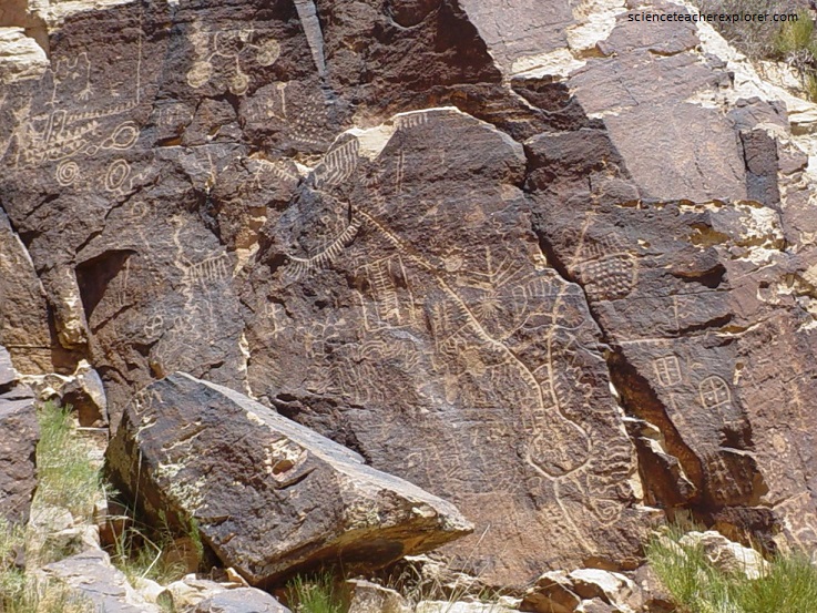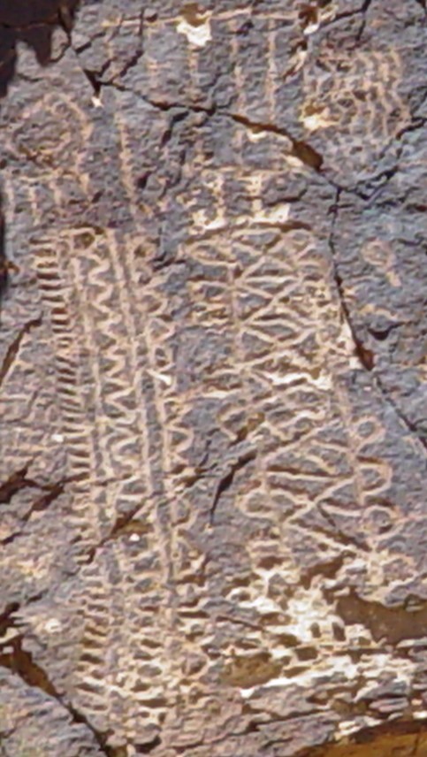 Pictured below, the most interesting feature of this site is a very large and deeply inscribed petroglyph known as the “Zipper”. The archaeologists mentioned above, believed the “Zipper” is a composite map (space) and numerical calendar (time). This rather strange shaped figure looks like a very large “V” with a lobe at the vertex. Along both branches of the “V” are many tick marks giving its’ lines a zipper like appearance.