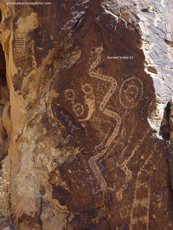 Pictured below is the spider pertoglyph. According to Garth Norman, this panel is a map of the peaks of the Red Hills with six legs matching the slope ridges most visible with melting winter snow. The strange squiggly line at the top of the panel is of a map of the Red Hills north hunting trails, a gap south pass hills, and a basin south pass and ridges. The two spider-like figures are the south Red Hills ridges. The humanoid figure is of the sacred “Spider Woman” with antennae that are spider like antennae. On the right is a “Sun Serpent” that has 45 dots that equal the 45 days from May 5-August 5 Cross-Quarters count to solstice. The combs on the left and bottom are lunar counts.