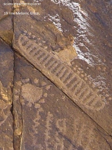 Pictured above, just above the 12 lunation year-glyph is a very well done 19 teeth smile glyph. It runs along a prominent crack in the rock surface. On summer solstice, June 21, 2005, the moon rose at its southern extreme standstill and illuminated this smile with a shadow line around it’s left side and bottom. This occurs once every 18.6 years in the moon’s Metonic cycle. The upper right 19-step ladder (nearest whole number to 18.6) records this cycle and points toward the a circle behind the boulder (pictured below). The next viewing of the southern extreme standstill of the Moon, at this site, is on June 21, 2024 at 9:54 P.M. (pictured below).